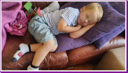 26 juni: Ik vind het soms toch nog een beetje te vermoeiend en dan ga ik lekker een tukkie doen op de bank. En mijn mond schoonmaken na wat te hebben gegeten let ik niet zo op, dat mogen papa en mama straks weer schoon boenen......