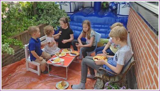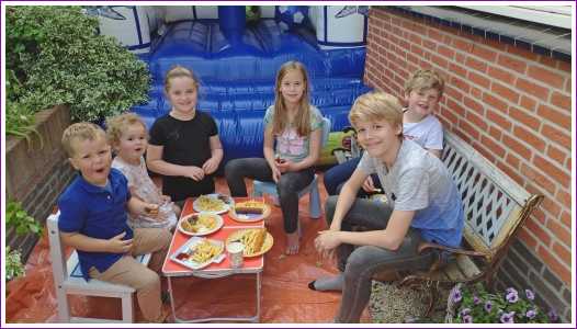 18 mei: Vanochtend kwamen ze thuis een heel groot springkussen brengen dat op de oprit is gezet en wat het hele weekend blijft staan. Alle buurkinderen en andere vriendjes en vriendinnetjes kwamen langs om samen mijn verjaardag te vieren. Aan het eind van de middag hebben we ook nog samen gegeten.........