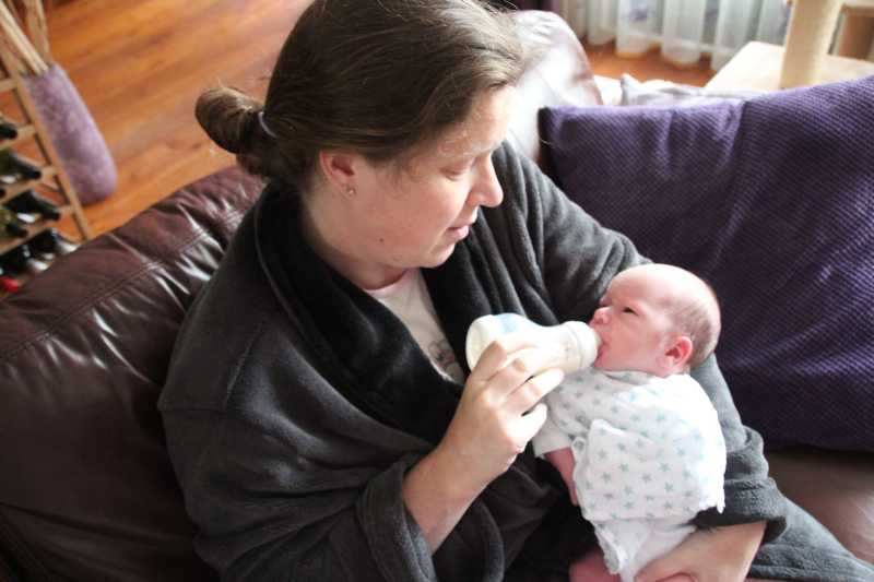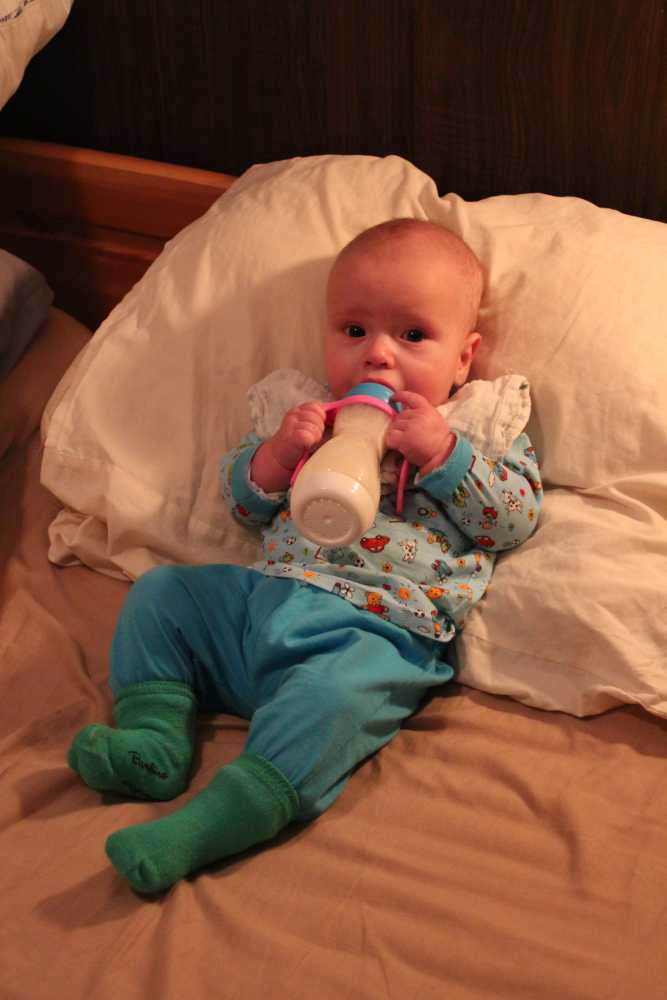 8 oktober: Ik kan inmiddels al zelfstandig mijn fles drinken, gewoon lekker liggend op bed.........