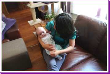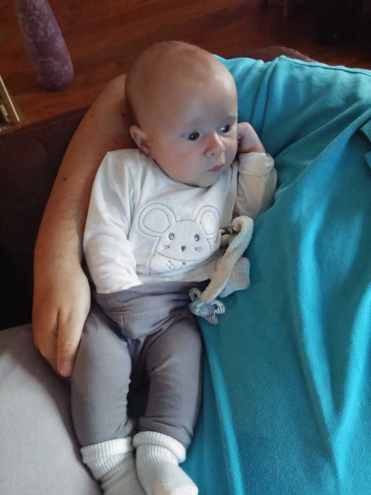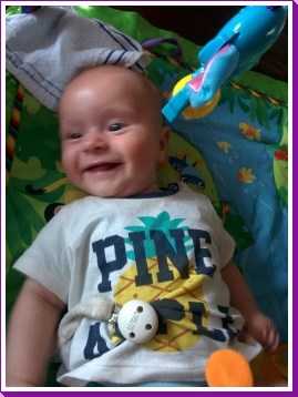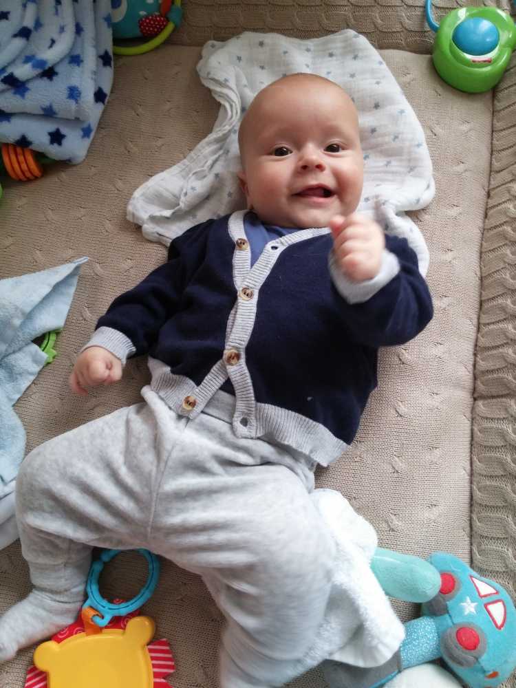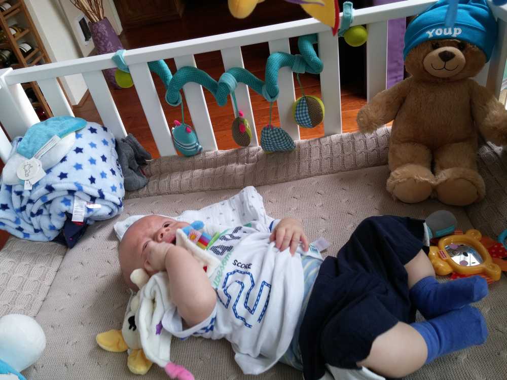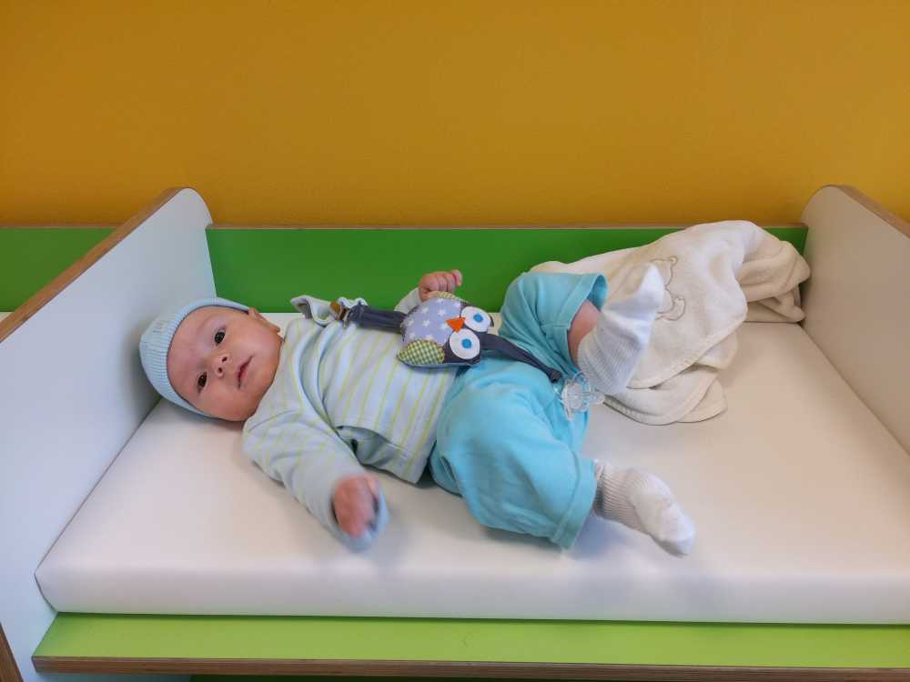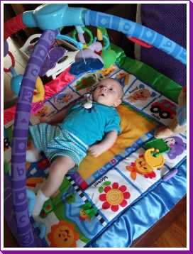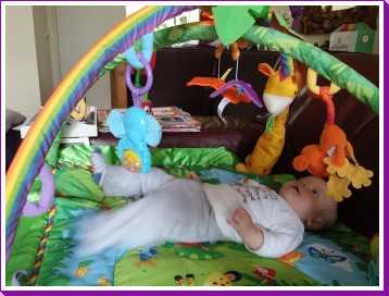 1 september: Vanochtend ben ik met mama en oma bij Patricia Kleij geweest. Eenmaal thuis daarvan heb ik op mijn buik liggen oefenen met draaien op het speelkleed op de bank. Mama zat naast me dus er kon niets gebeuren.