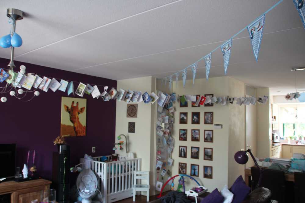 16 juli: Vandaag mocht ik weer met mama naar de babymassage. Daarna thuis nog even alle kaarten die ik gekregen heb op de foto gezet. Toen nog even gechilt op mijn speelkleed totdat papa thuis kwam.