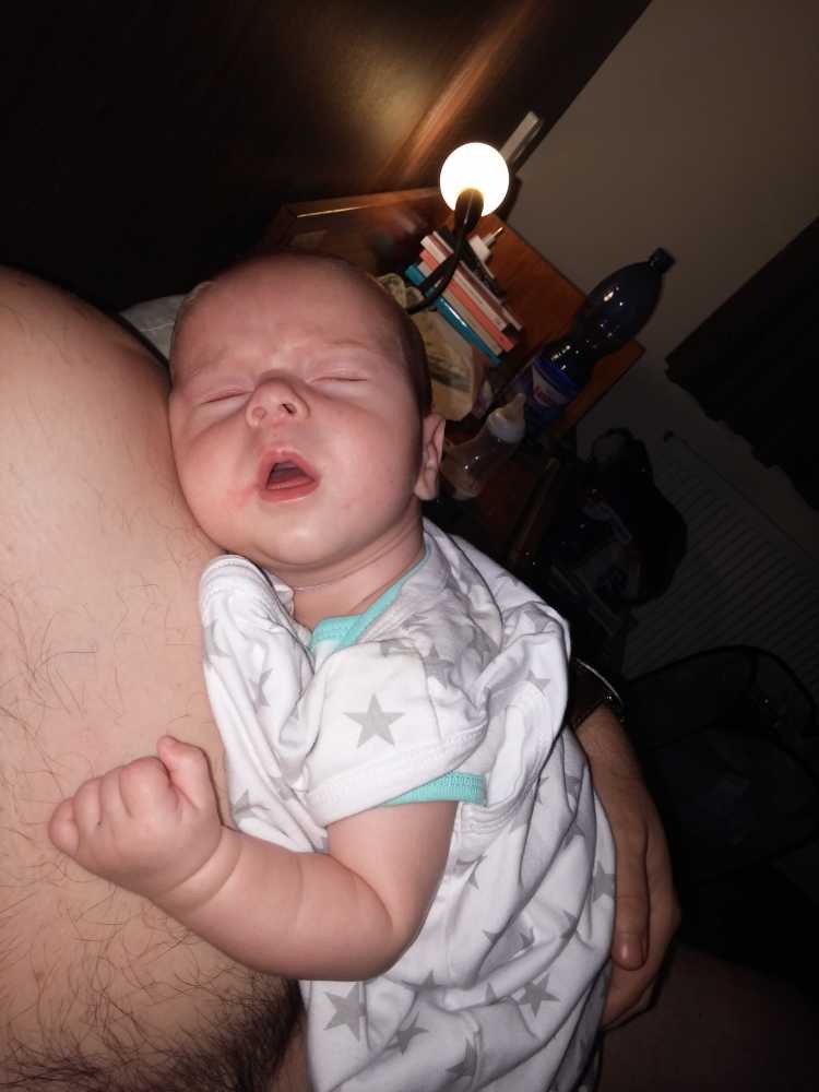 Na zo'n vermoeiende dag kan ik het niet meer opbrengen om na mijn laatste fles te boeren, dus ik val gewoon bij papa op de schouder in slaap.