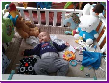 25 september: Ik ben vandaag met mama bij opa en oma geweest waar ook tante Marlou en nichtje Puk waren. Eenmaal terug thuis ben ik tijdens mijn middagtukje rondjes gaan draaien en kwam ik bijna klem te zitten in mijn bed. Gelukkig kon ik er achteraf weer om lachen........