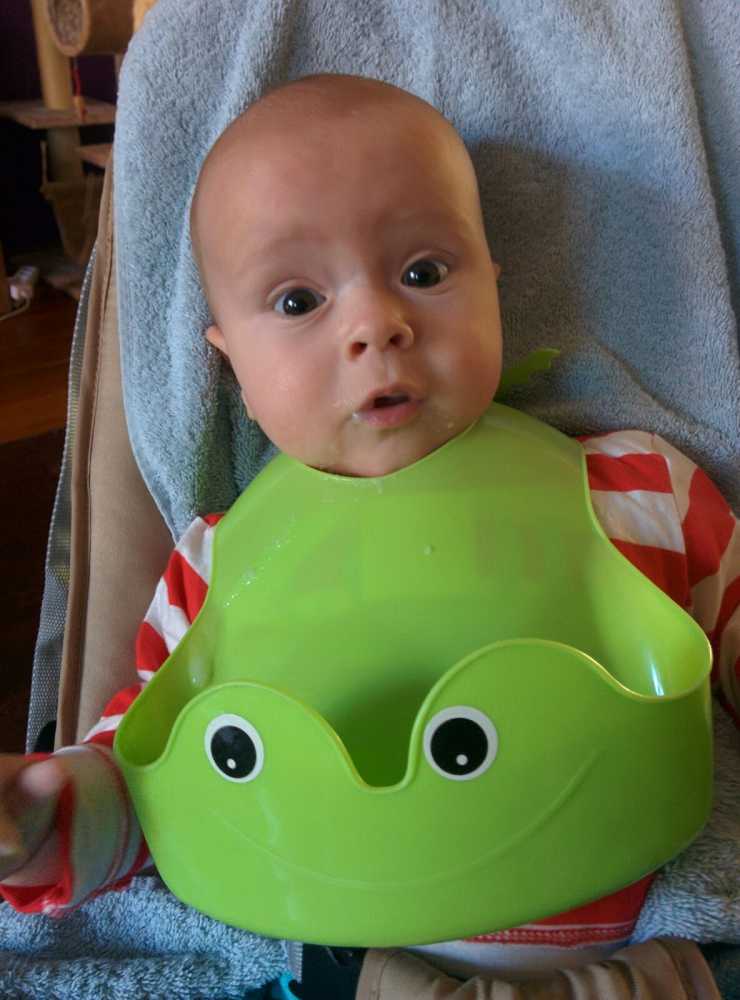 30 september: Papa heeft mij vandaag een nieuwe slabber omgedaan om mij te voeden, dat is even wennen maar ik ben toch al snel weer overtuigd.....