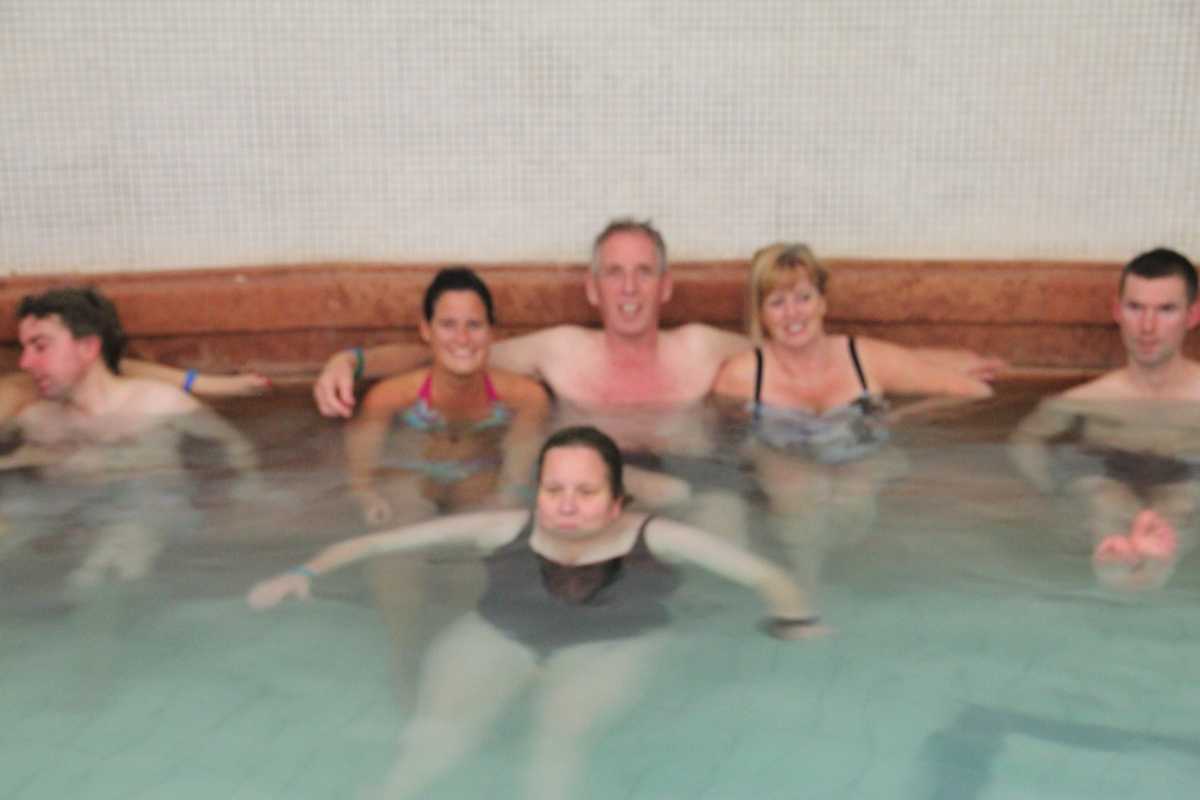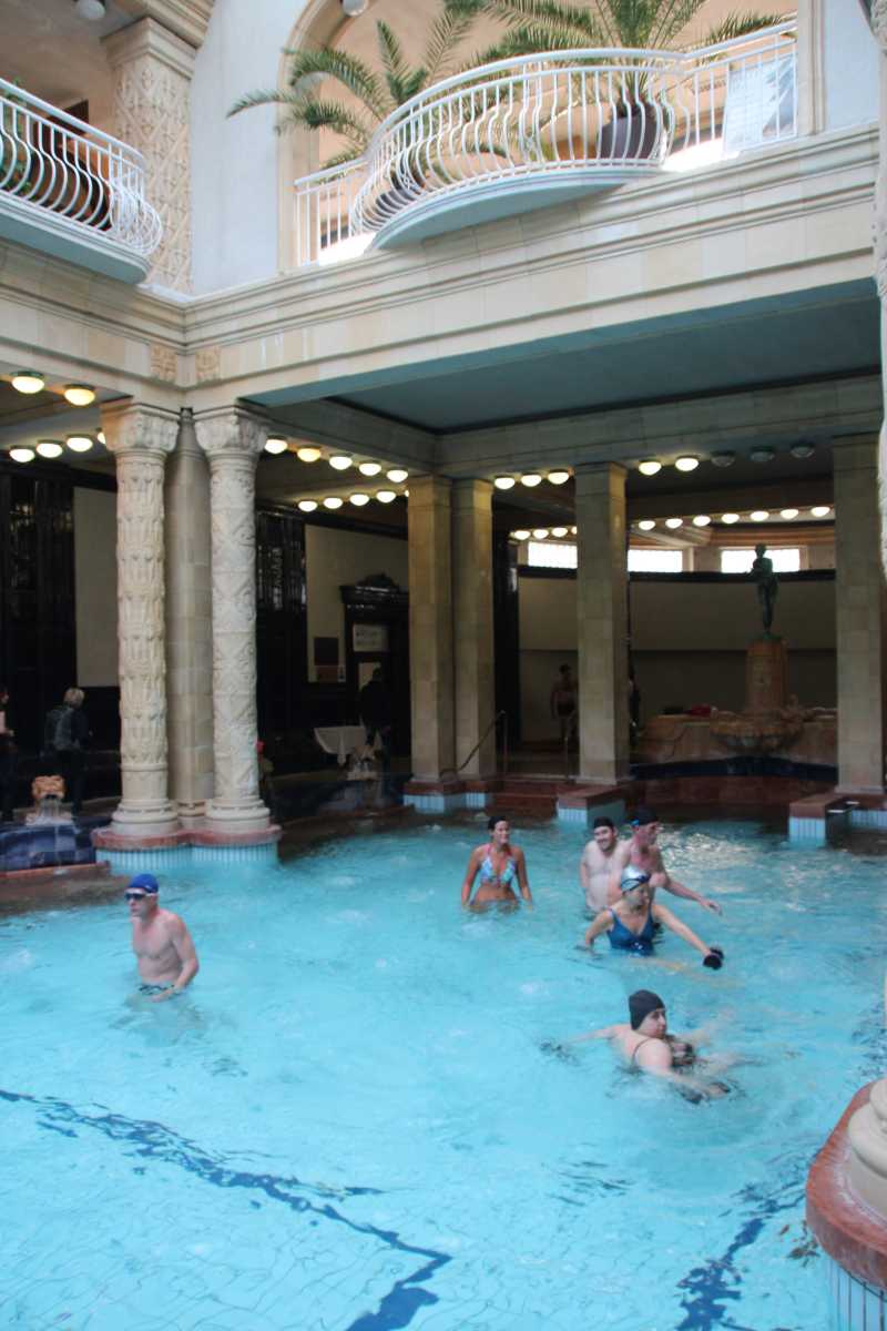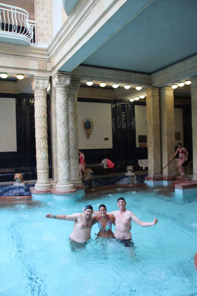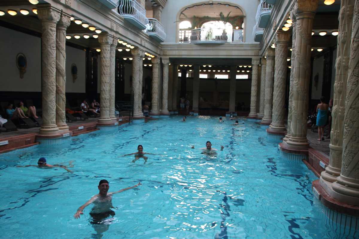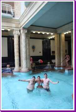 We rijden nog even langs het Keleti treinstation, een mooi oud gebouw, helaas niet echt goed onderhouden. Verder naar ons hotel, dit ligt aan de Boeda-zijde. Vanaf 1 van de bruggen zien we meteen al veel moois, wat we zeker nog gaan bekijken dit weekend. Ons pension is zo gevonden, onze kamers liggen 2 huizen verderop van de receptie, en zijn prima voor het bedrag wat we ervoor hebben betaald. We leggen onze spullen op onze kamers, en gaan naar het Gellért badhuis, dit schijnt het oudste en mooiste badhuis van Boedapest te zijn. We beginnen bij de buitenbaden. Emiel, Anja en Erik dippen in het thermale bad van 36 graden, Fenna en Jantine zijn wat sportiever en trekken wat baantjes in het grote ‘golvenbad’. Helaas stond de golvenmachine-maker uit. Voor het grote binnenbad hebben we nog leuke badmutsjes moeten kopen (we zoeken nog het nut van die badmutsjes, aangezien we mannen zagen met grote baarden en gelukkig wel een badmuts op, en vrouwen met lang haar, die geen enkele haar in die badmuts hadden gestopt). Erik, Emiel en Fenna doen nog even mee met de lokale aquafit groep. Uiteindelijk plonzen we alle 5 in het zwavel binnenbad en zien wat dode mannen rondgetrokken worden door hun partners.