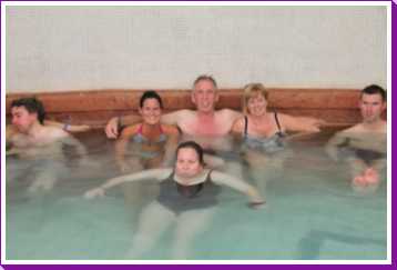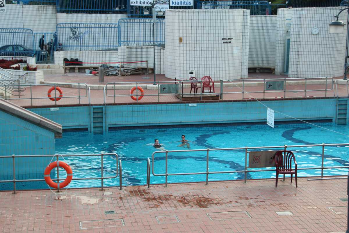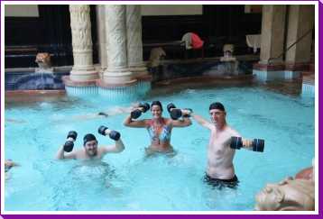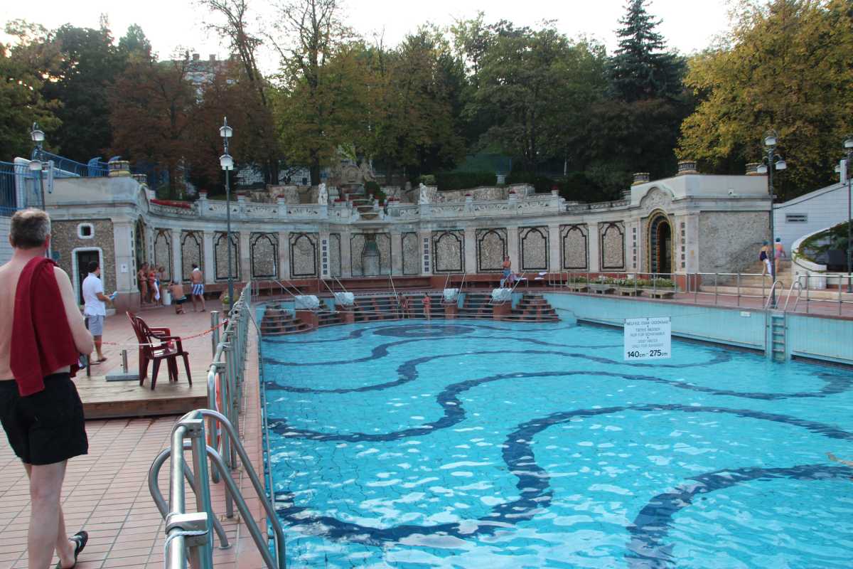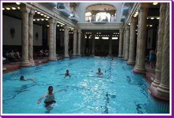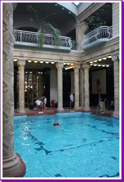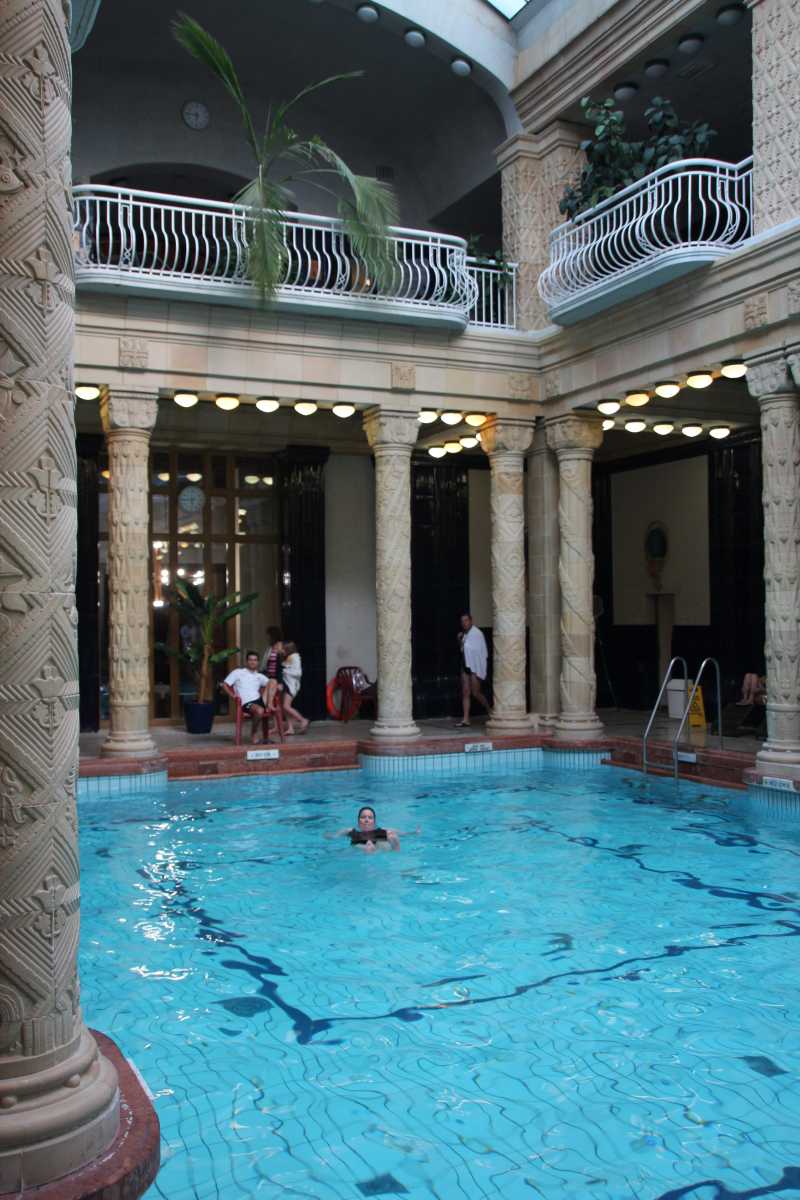 We rijden nog even langs het Keleti treinstation, een mooi oud gebouw, helaas niet echt goed onderhouden. Verder naar ons hotel, dit ligt aan de Boeda-zijde. Vanaf 1 van de bruggen zien we meteen al veel moois, wat we zeker nog gaan bekijken dit weekend. Ons pension is zo gevonden, onze kamers liggen 2 huizen verderop van de receptie, en zijn prima voor het bedrag wat we ervoor hebben betaald. We leggen onze spullen op onze kamers, en gaan naar het Gellért badhuis, dit schijnt het oudste en mooiste badhuis van Boedapest te zijn. We beginnen bij de buitenbaden. Emiel, Anja en Erik dippen in het thermale bad van 36 graden, Fenna en Jantine zijn wat sportiever en trekken wat baantjes in het grote ‘golvenbad’. Helaas stond de golvenmachine-maker uit. Voor het grote binnenbad hebben we nog leuke badmutsjes moeten kopen (we zoeken nog het nut van die badmutsjes, aangezien we mannen zagen met grote baarden en gelukkig wel een badmuts op, en vrouwen met lang haar, die geen enkele haar in die badmuts hadden gestopt). Erik, Emiel en Fenna doen nog even mee met de lokale aquafit groep. Uiteindelijk plonzen we alle 5 in het zwavel binnenbad en zien wat dode mannen rondgetrokken worden door hun partners.