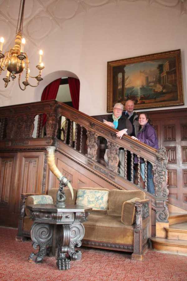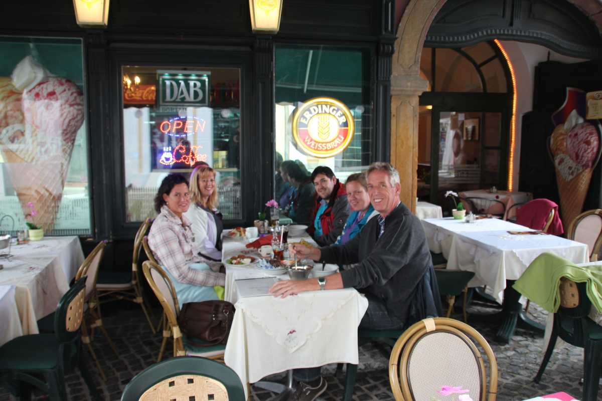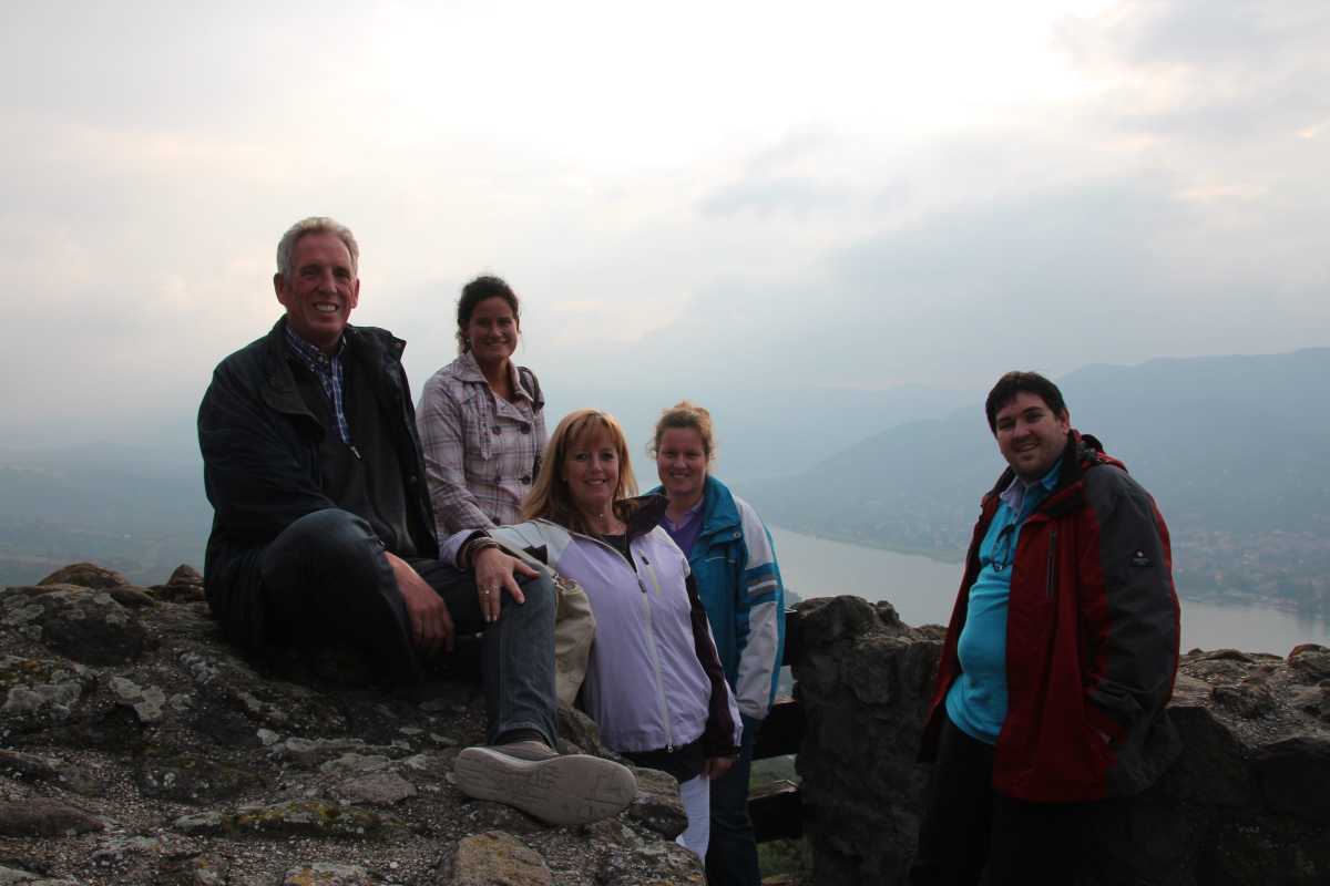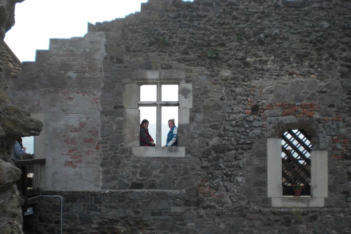 We besluiten eerst naar het hoogste kasteel te gaan, stukje met de auto naar boven daarna lopend. Mooi uitzicht over de Donau. We lopen door het kasteel en maken nog wat leuke foto van ons door doorkijkjes etc. Daarna gaan we terug naar de auto en rollen we terug de berg af, letterlijk rollen, want Emiel wil kijken hoe ver we komen zonder gas te geven nadat we de parkeerplaats af zijn. Op een paar kleine vlakke delen na komen we nagenoeg zonder gas geven beneden. Tijd voor koffie, dus we zoeken een geschikt etablissement op. Het wordt een klein zaakje dat koffie en gebak heeft maar ook ijs. Iedereen neemt koffie met een gebakje, behalve Jantine, die gaat meteen voor het ijs. Nadat de koffie genuttigd is nemen we nog een toetje, dus alsnog ijs. Jantine kon er ook nog wel een bolletje bij.
