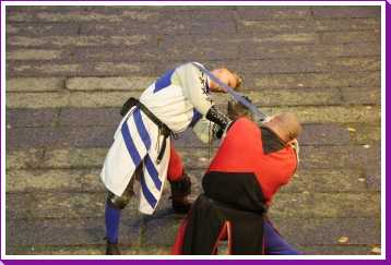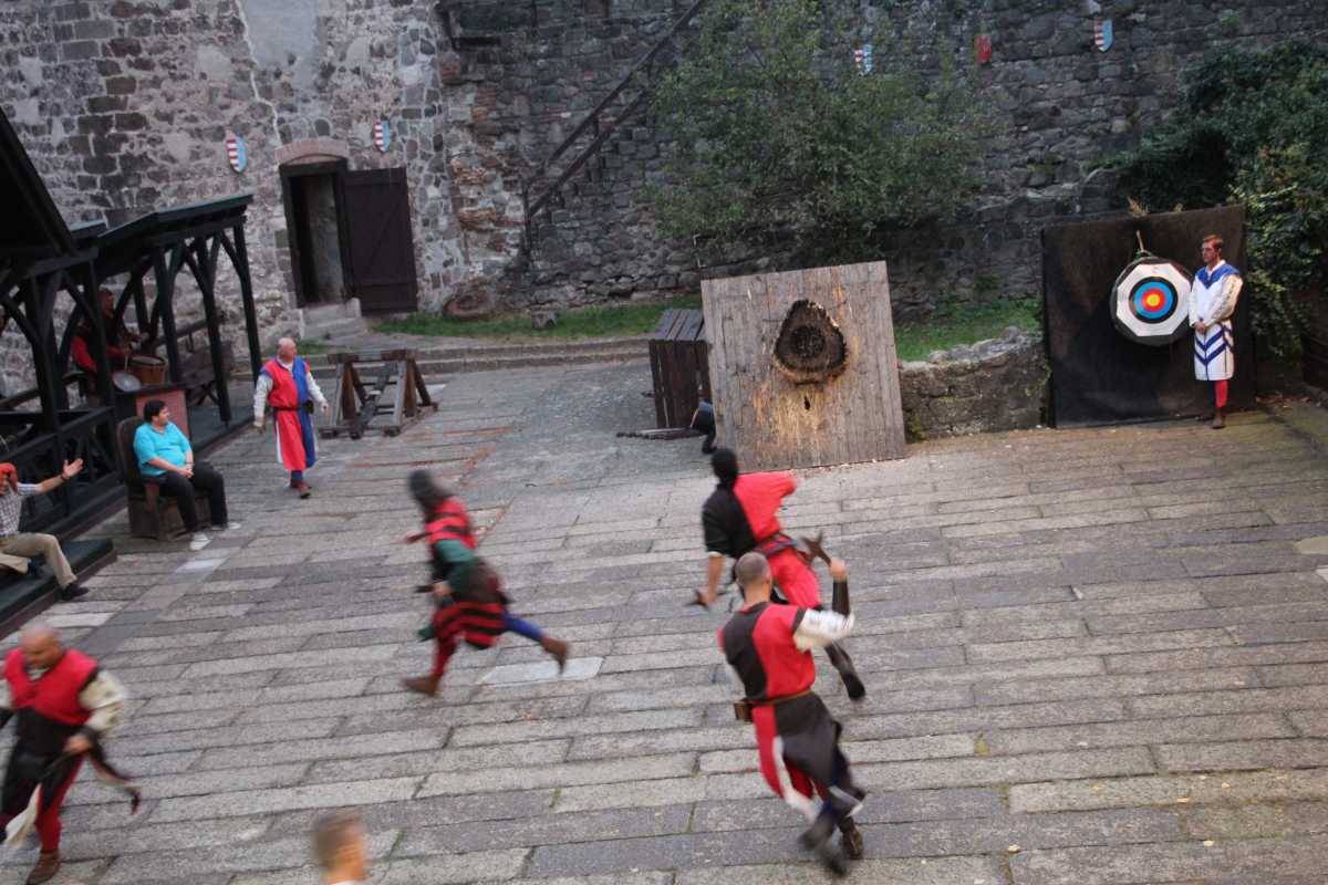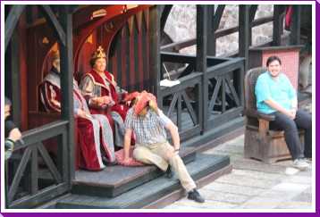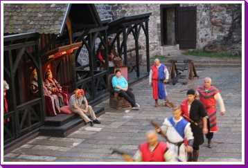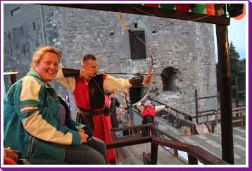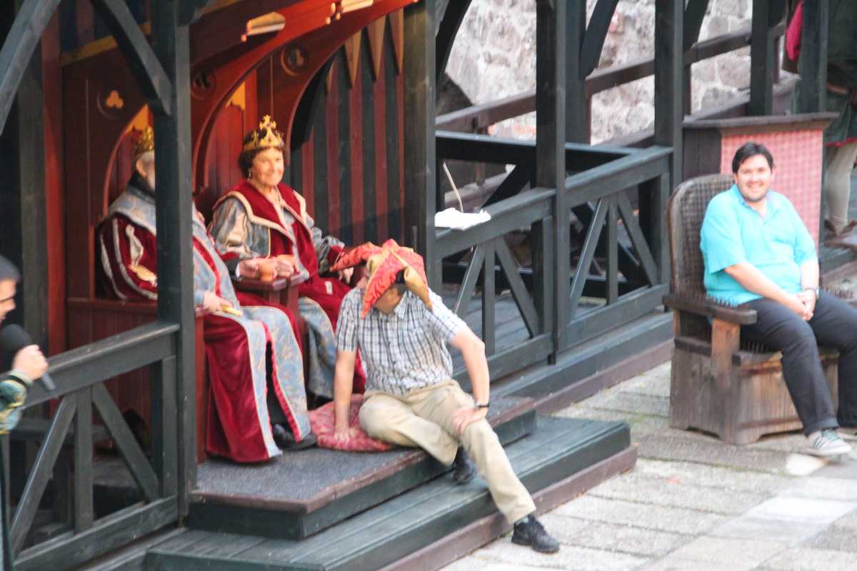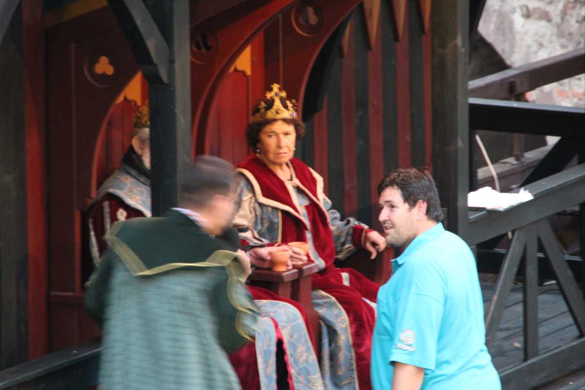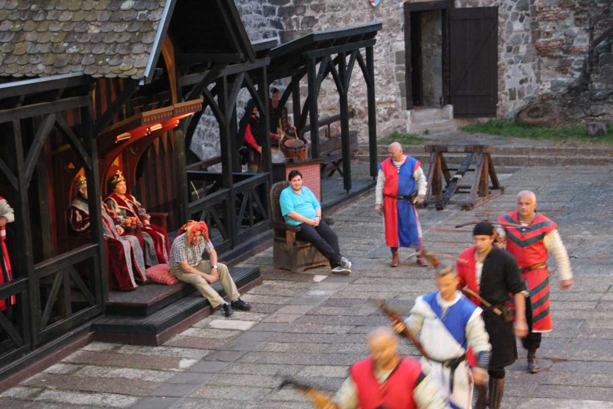 Inmiddels is het tijd om naar het lagere kasteel te gaan voor het Knights' Tournament dat hier gehouden werd. Dit zou om 18.00 beginnen, maar bij aankomst waren er al twee busladingen Italianen gearriveerd zodat men net al begonnen was met de uitleg. We vielen er dus wat later in dan bedacht, maar we mochten meteen de glazen laten vullen om mee te nemen. Zodoende klommen we naar boven om in de toren van het uitzicht te genieten. Daarna weer naar beneden naar de binnenplaats alwaar het tournament zou plaatsvinden. Na enige uitleg werden er een koning en een koningin gekozen uit het voornamelijk Italiaanse publiek. Daarna vroeg men nog iemand, doch was niet duidelijk waarvoor, we dachten dat men nog een nar nodig had. Emiel hield zijn arm achter Erik omhoog zodat die uiteindelijk daadwerkelijk naar beneden mocht. Echter niet voor de functie nar, maar als een crimineel die gestraft moest worden. Erik mocht op de spijkerstoel vlak naast het koningspaar. Daarna werd er nog een Italiaan gevraagd, ditmaal wel om de rol van de nar te vervullen.