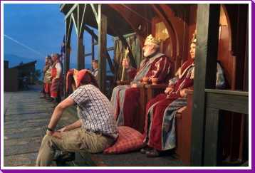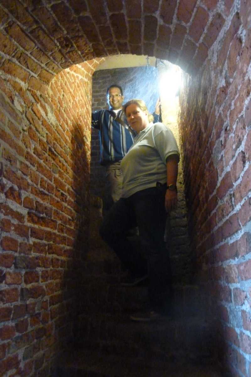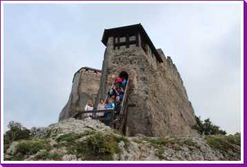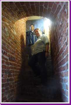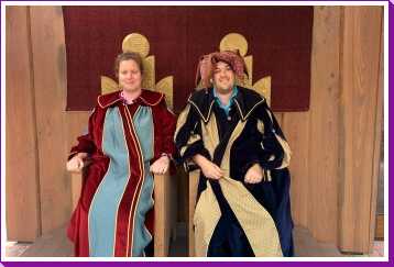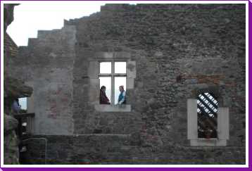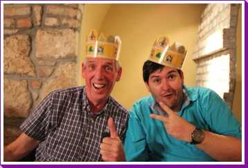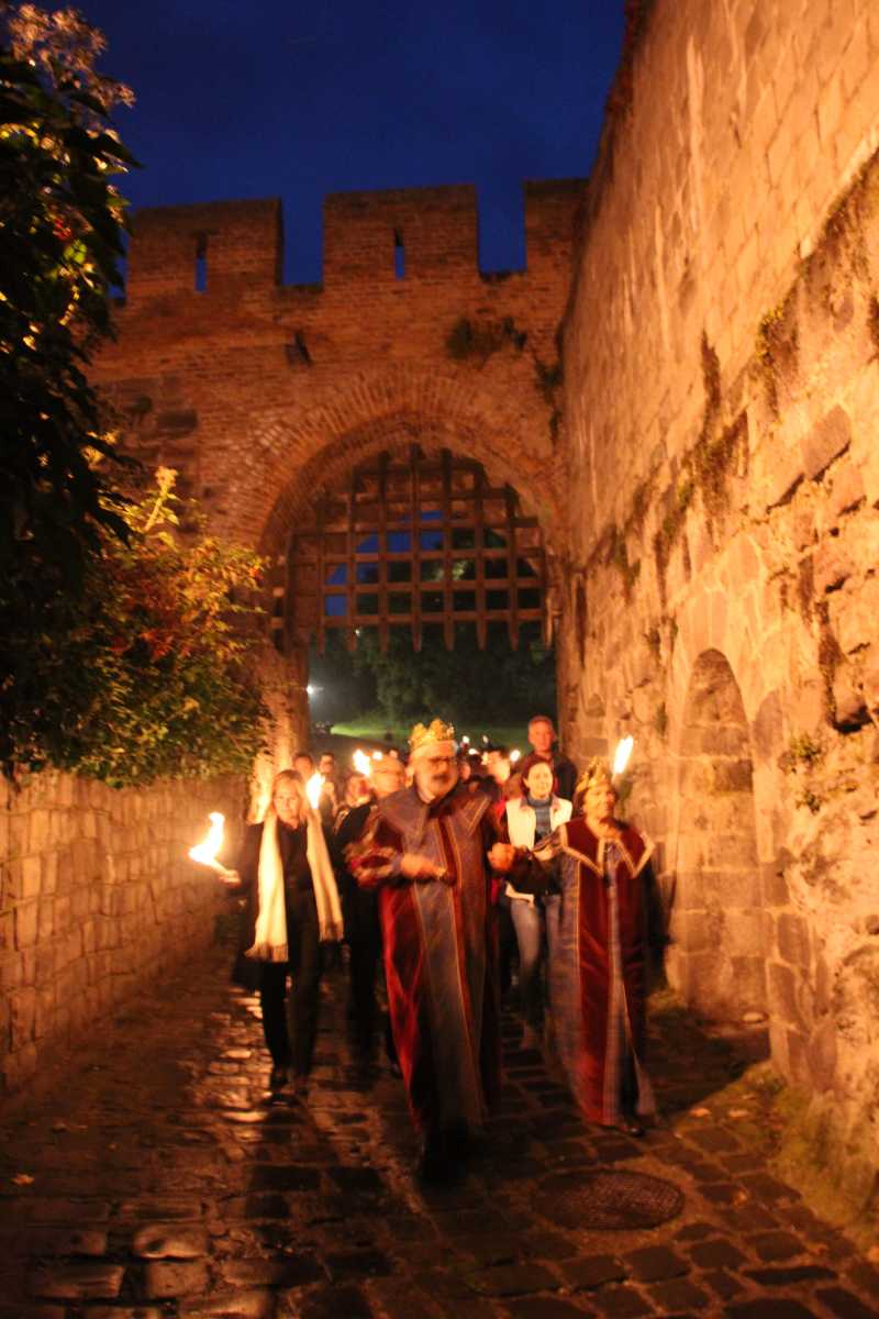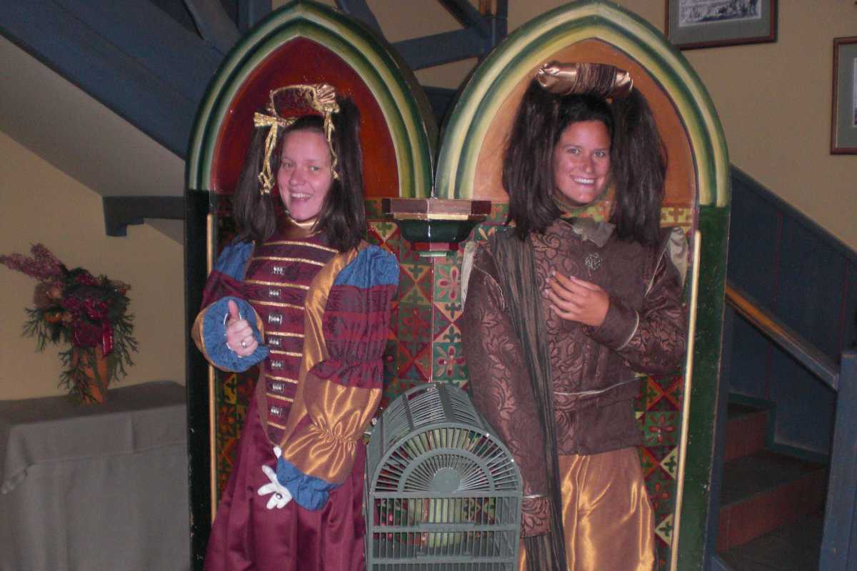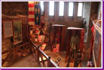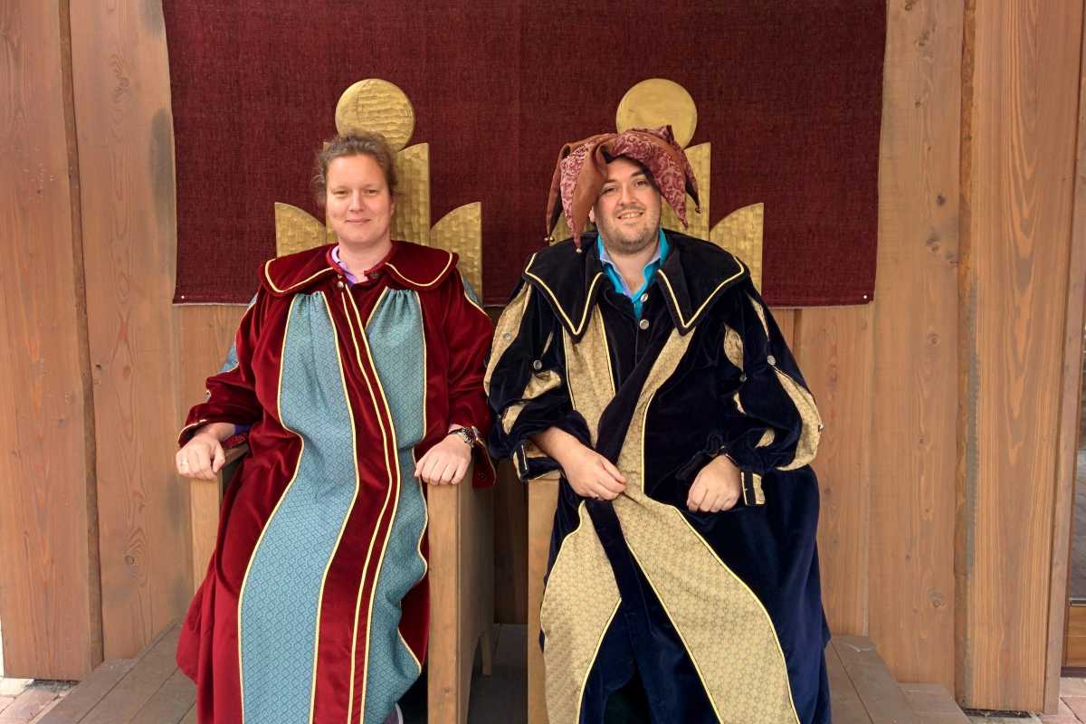 Inmiddels is het tijd om naar het lagere kasteel te gaan voor het Knights' Tournament dat hier gehouden werd. Dit zou om 18.00 beginnen, maar bij aankomst waren er al twee busladingen Italianen gearriveerd zodat men net al begonnen was met de uitleg. We vielen er dus wat later in dan bedacht, maar we mochten meteen de glazen laten vullen om mee te nemen. Zodoende klommen we naar boven om in de toren van het uitzicht te genieten. Daarna weer naar beneden naar de binnenplaats alwaar het tournament zou plaatsvinden. Na enige uitleg werden er een koning en een koningin gekozen uit het voornamelijk Italiaanse publiek. Daarna vroeg men nog iemand, doch was niet duidelijk waarvoor, we dachten dat men nog een nar nodig had. Emiel hield zijn arm achter Erik omhoog zodat die uiteindelijk daadwerkelijk naar beneden mocht. Echter niet voor de functie nar, maar als een crimineel die gestraft moest worden. Erik mocht op de spijkerstoel vlak naast het koningspaar. Daarna werd er nog een Italiaan gevraagd, ditmaal wel om de rol van de nar te vervullen.