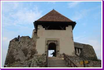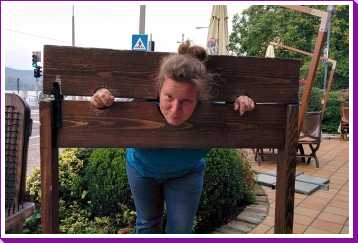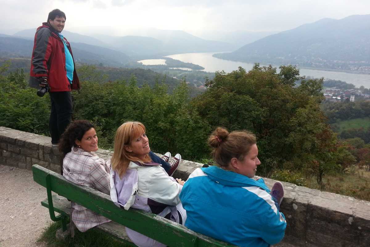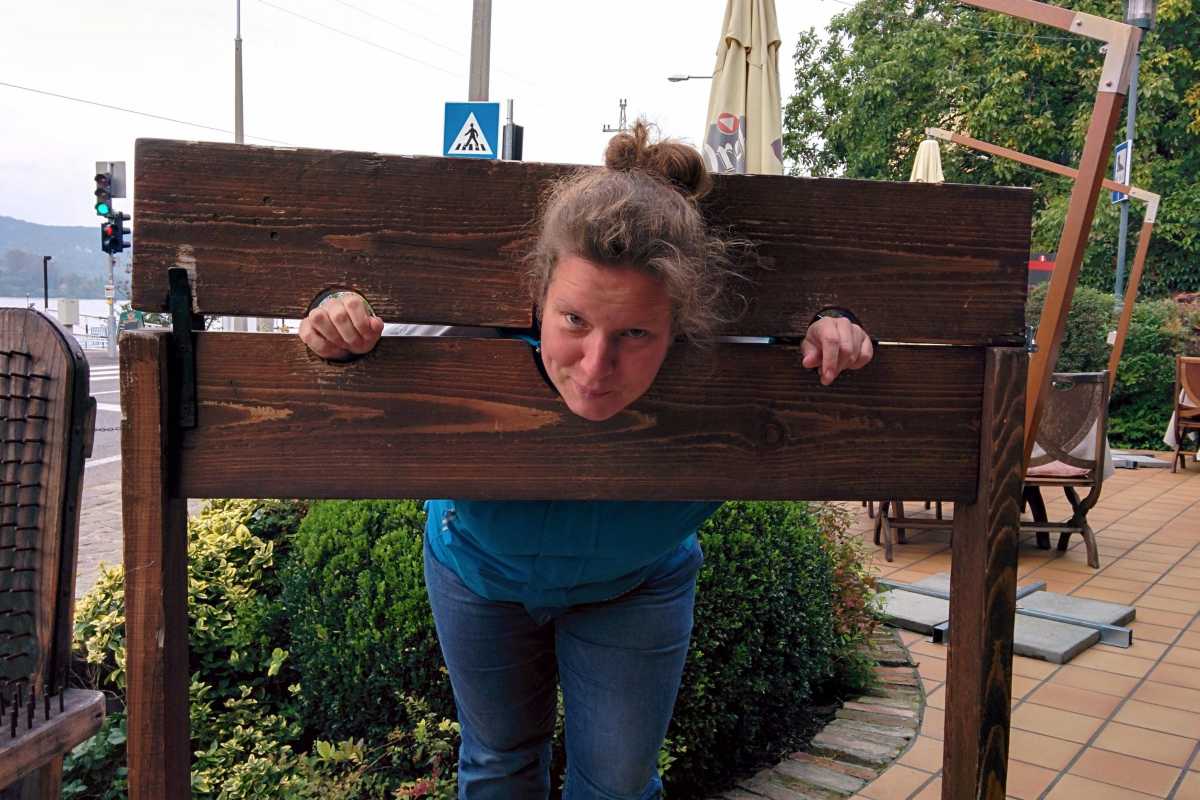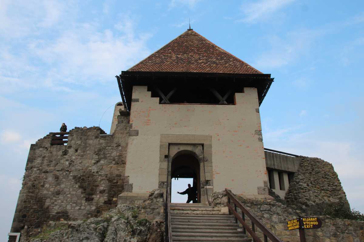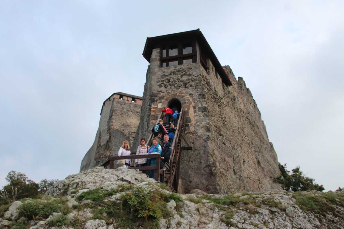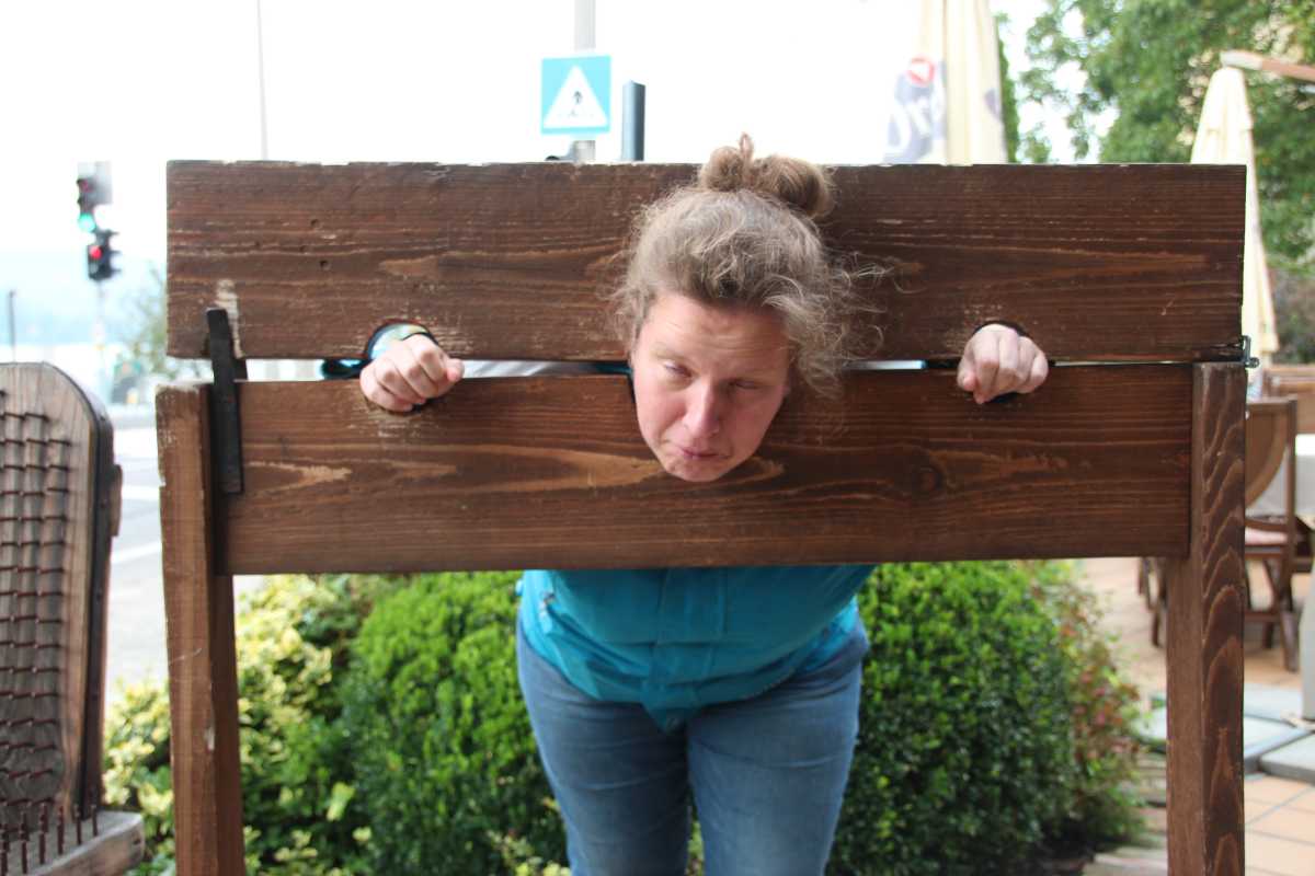 Door naar Visegrád, hier zouden wat ridderspelen worden georganiseerd vandaag. Gestopt bij een lokaal toeristen plekje bij de VVV, waar we een mooi uitzicht hadden op het kasteel wat hoog boven op de berg lag en waar we ons konden verkleden voor de foto. Uiteraard even gedaan. Bij een lokaal thema restaurant wat informatie gevraagd over waar en wanneer nu alles begon. Hier stond buiten ook een spijkerstoel en een schavot, dus uiteraard even proberen.