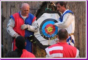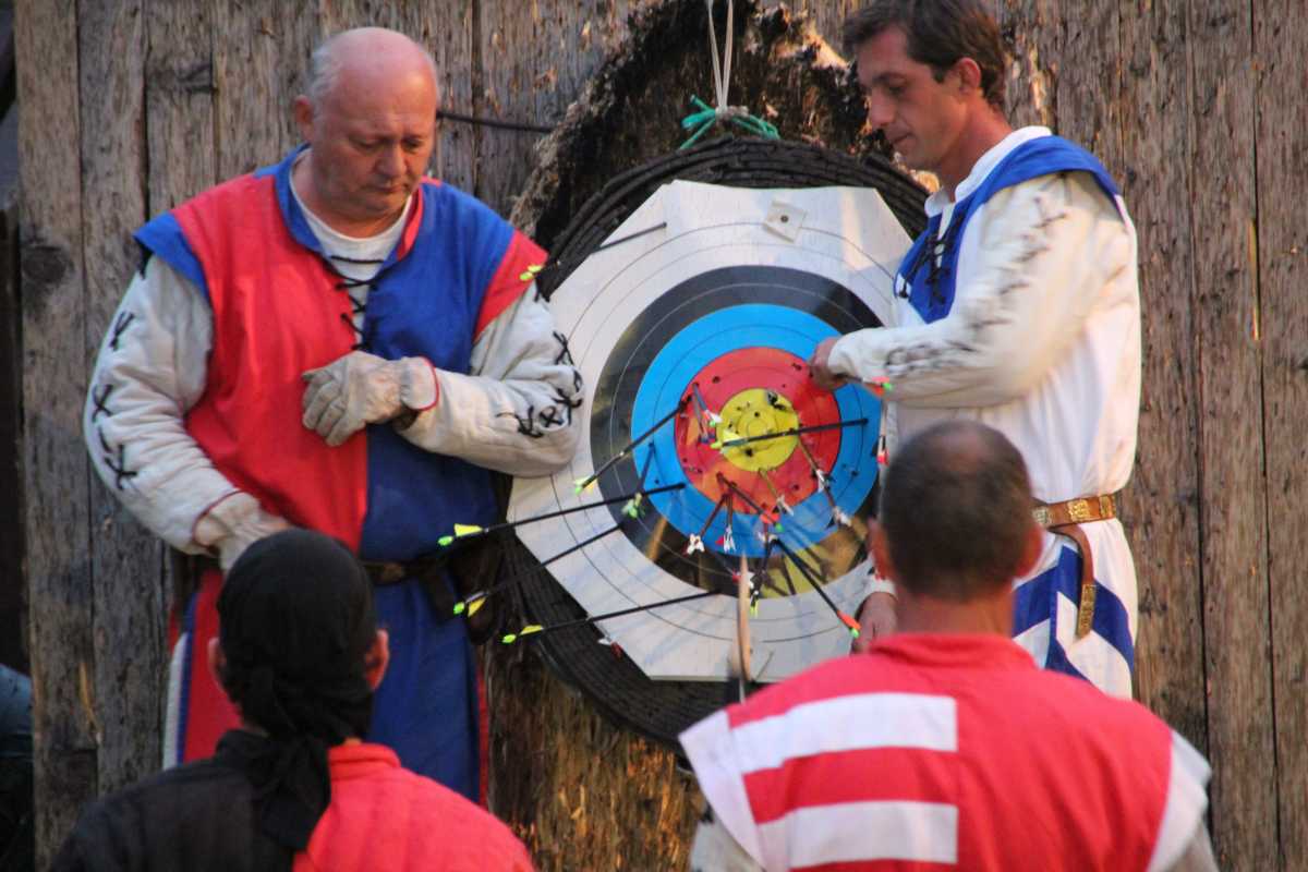 Daarna begon het echte werk, de pijlen en bogen kwamen tevoorschijn en alle wapentuig uit die tijd werd uitvoerig gedemonstreerd. Erik kon hierbij foto’s maken en filmen vanuit een andere hoek dan Jantine, hier is dus genoeg beeldmateriaal van. Tegen het einde van de demonstratie mocht Erik ook weer van de spijkerstoel af, dat zat toch niet zo erg lekker….. Nu mocht het publiek zelf nog de werpijzers komen proberen. Emiel, Erik en Jantine hebben het dus geprobeerd met wisselend succes. Wij kregen uiteindelijk toch een aantal ijzers vast in de boomstam geworpen.
