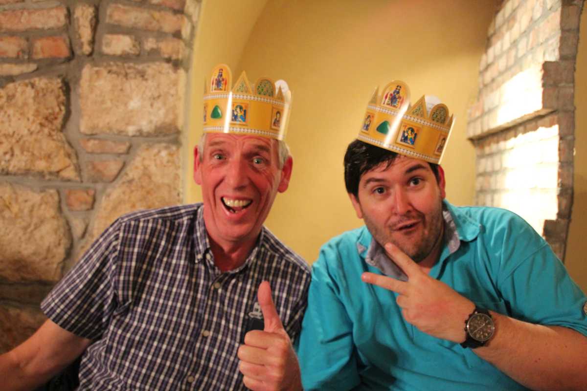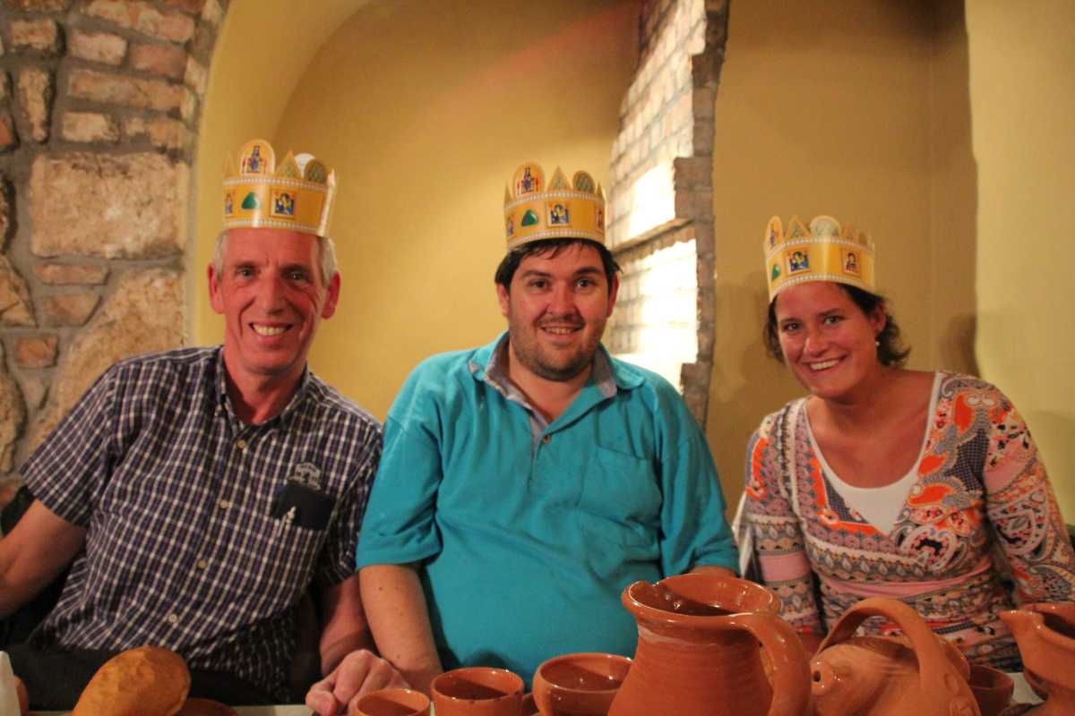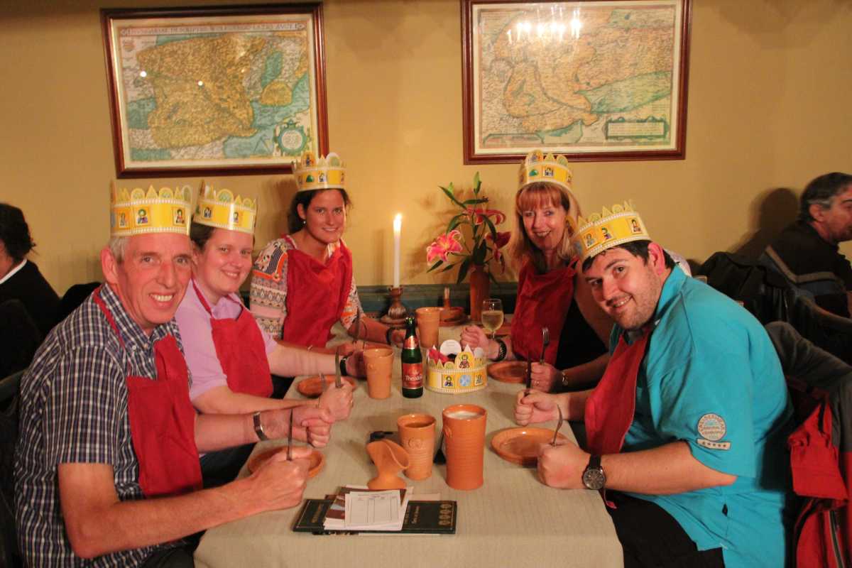 Daarna was het tijd om te verzamelen om terug naar beneden te lopen. Een aantal mensen kreeg een fakkel om de weg naar beneden te verlichten. Achter het koningskoppel aan liepen we in processie naar beneden tot bij het restaurant. Hier was er een koningsmaal geprepareerd, althans voor de Italianen, wij mochten a-la-carte eten. We kregen aardewerken bekers en borden, dus alles was in stijl. Er waren zelfs kartonnen kronen voor iedereen...