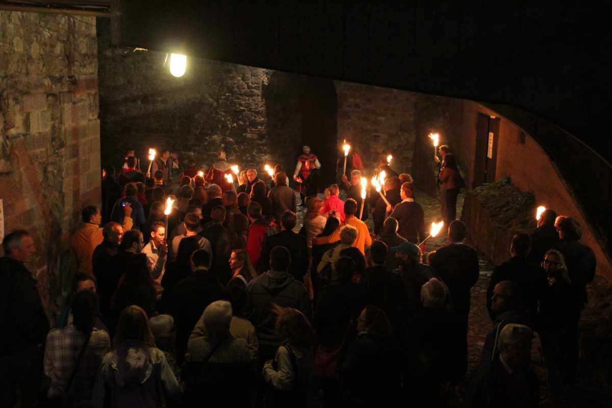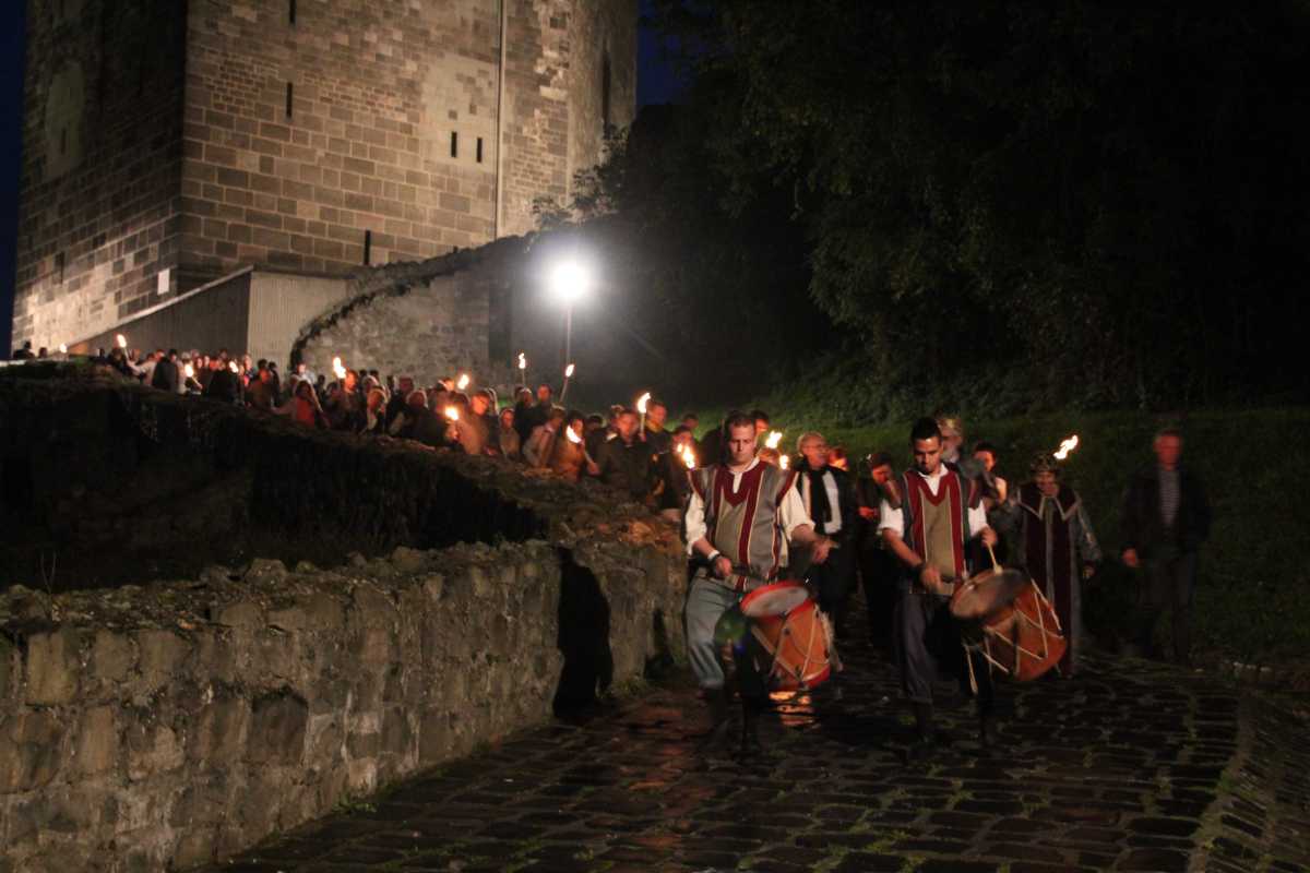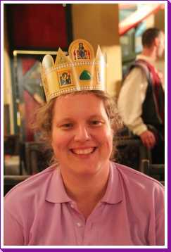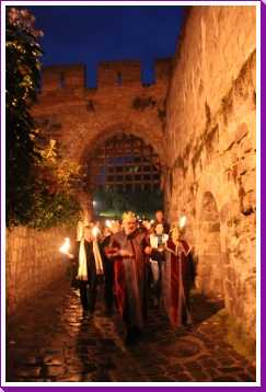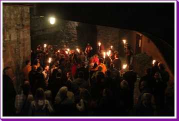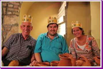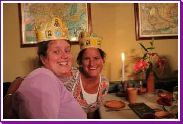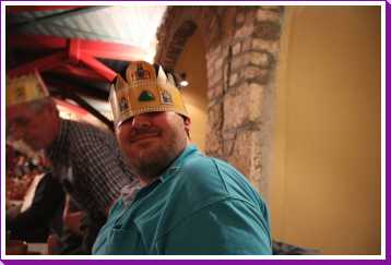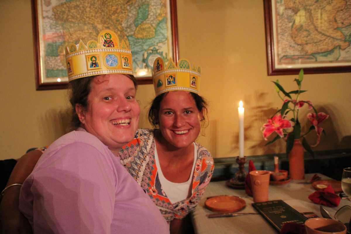 Daarna was het tijd om te verzamelen om terug naar beneden te lopen. Een aantal mensen kreeg een fakkel om de weg naar beneden te verlichten. Achter het koningskoppel aan liepen we in processie naar beneden tot bij het restaurant. Hier was er een koningsmaal geprepareerd, althans voor de Italianen, wij mochten a-la-carte eten. We kregen aardewerken bekers en borden, dus alles was in stijl. Er waren zelfs kartonnen kronen voor iedereen...