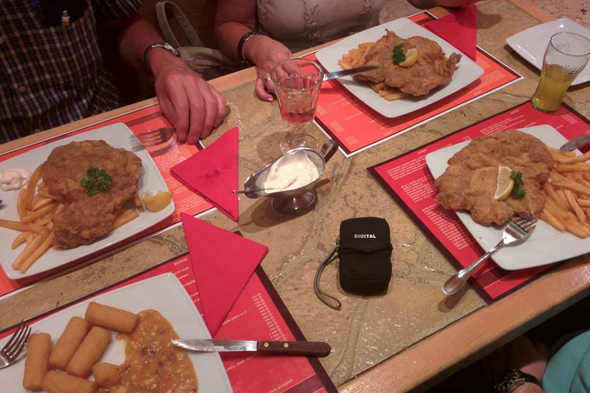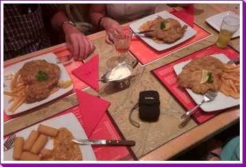 Omdat het nu tegen het einde van de middag was moesten we ons terug richting auto begeven voor een ritje naar het vliegveld, Fenna zou immers al zondagavond terug vliegen richting Rotterdam aangezien zij de maandag gewoon weer moest werken. Het ging allemaal vlotjes en dus stopten we bij de Tesco waar we op de heenweg ook waren om daar bij een klein zaakje nog een ijsje te nemen en wat te drinken. Emiel had echter ook de KFC gezien en kon zich niet bedwingen om Anja te sturen voor een grote doos kipkluiven. Nadat Emiel die naar binnen had gewerkt konden we Fenna bij de luchthaven afzetten en zelf weer terug naar Boedapest rijden. Hier reden we direct naar het hotel om daar in het restaurant te gaan eten. Alhoewel we nu via een andere ingang binnen gingen om te informeren bleek het gewoon de ontbijtzaal die wat anders was ingericht. Het zag er wel goed uit en dus mochten de dames ook uit de auto komen. Hier heeft Erik een heerlijke steak op en de rest een lekkere schnitzel. Daarna hebben we nog een drankje genomen in de bar bij de receptie om vervolgens weer ons bed op te zoeken.