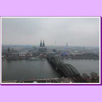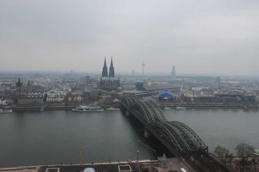 16-23 maart: De afgelopen week zijn we een weekje naar Duitsland geweest in het Moezelgebied. Jantine haar ouders waren ook met ons mee. We begonnen de zondag met een bezoek aan Keulen. Hiervoor zijn we eerst naar het hotel in Keulen gereden dat nog net buiten de 'Umweltzone' lag. Binnen die 'Umweltzone' mag je alleen komen als je een sticker op je auto hebt. Die sticker kost op zich niet zoveel, maar de verzendkosten naar Nederland zijn absurd hoog. Het was dus handiger buiten deze zone te blijven en van daaruit de S-bahn te nemen. Met een kwartiertje waren we alsnog in het centrum en stapten we uit net voor het centrum. Dit omdat aan de andere kant van het water nog een uitzichtpunt was op een toren, de zogenaamde Koeln Triangle.