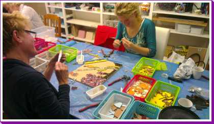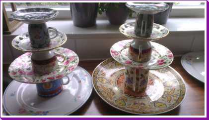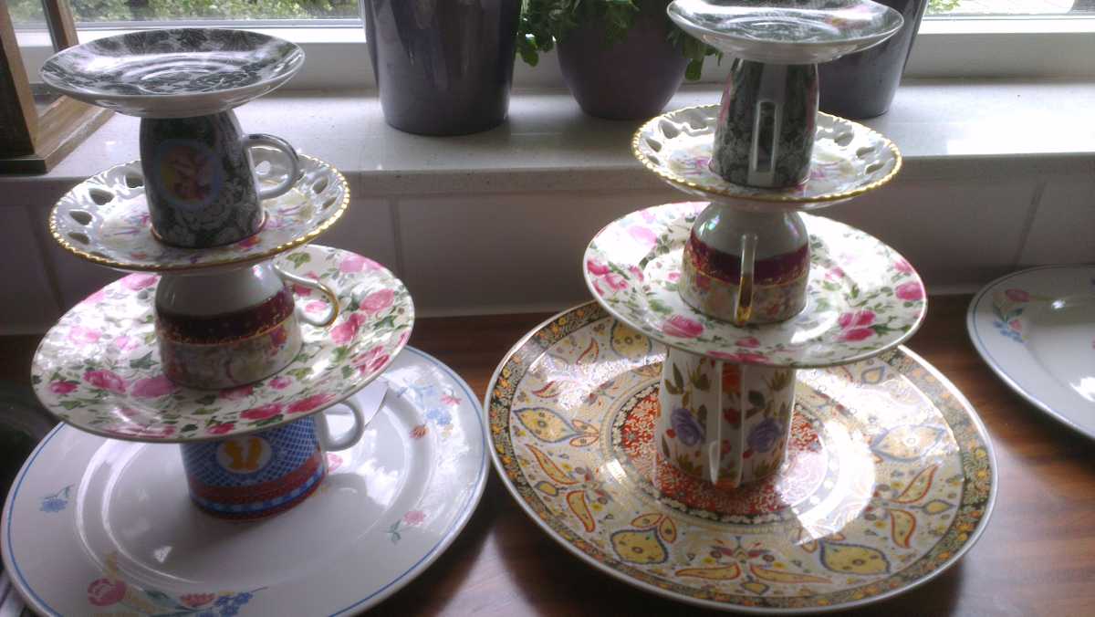 18 augustus: Met de nieuwe (oude) borden en kopjes die we van het weekend hebben gescoord op de markt in Zaanstad en in Beverwijk hebben we weer twee etagieres in elkaar gelijmd.....
