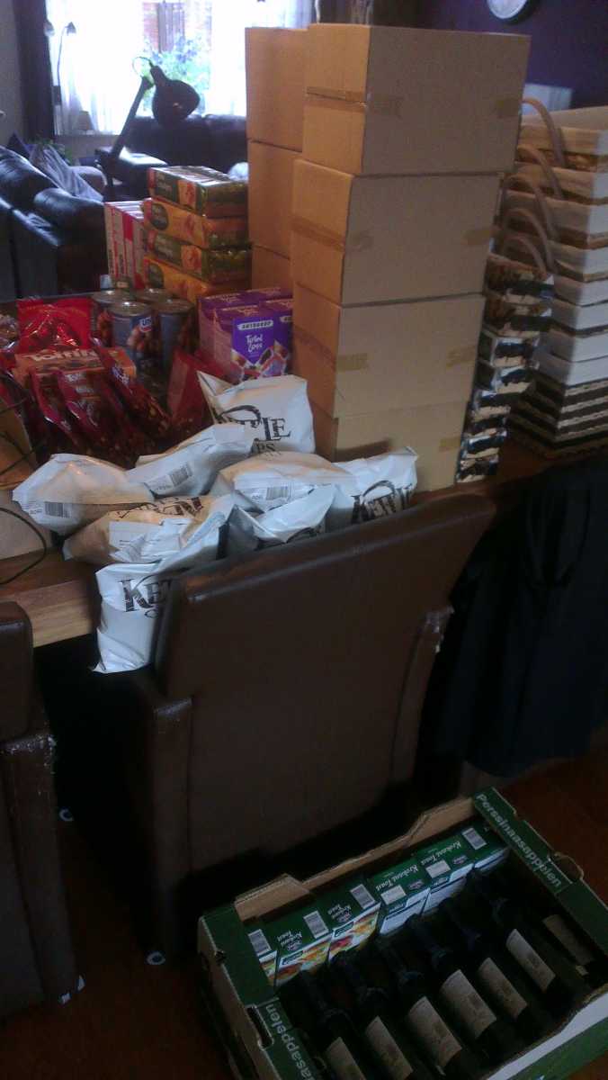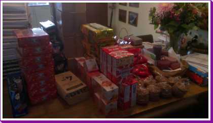 13 december: Dit jaar hebben we de kerstpakketten voor de praktijk eens zelf samengesteld. Zo kan je zelf kiezen wat er in gaat en bovendien kan je voor hetzelfde bedrag dan veel meer kopen. Na de aankopen stond de tafel thuis flink vol en kon het samenstellen beginnen. Dit was uiteindelijk ook maar een paar minuten werk. Het resultaat is leuk geworden.