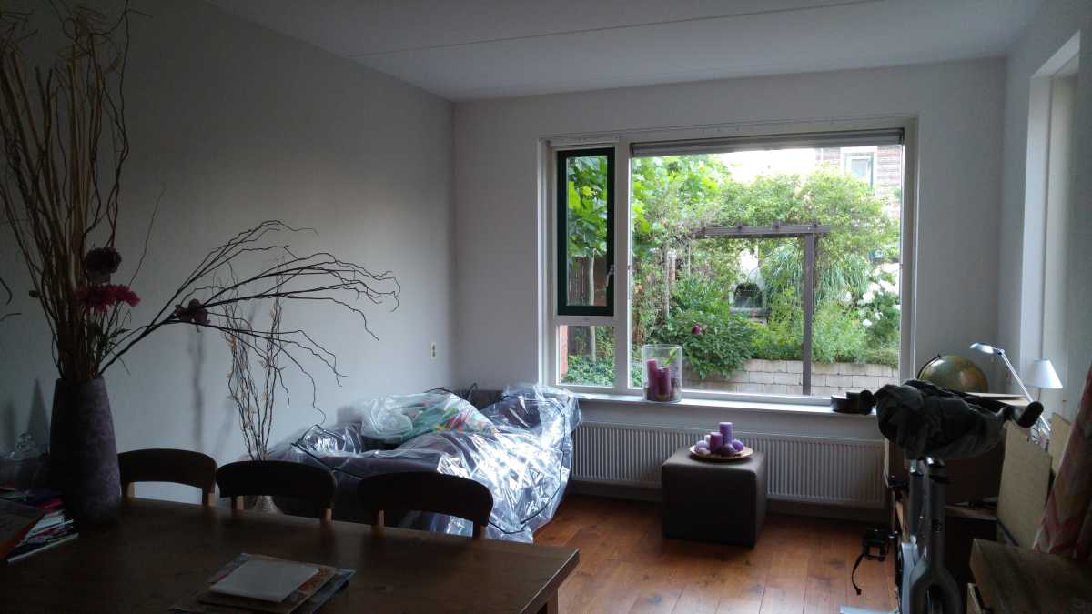 15 t/m 19 juli: Jantine heeft juist de afgelopen dagen in de tuinkamer de muren voorzien van een nieuwe kleur. De crémekleurige muren zijn nu wit geworden en de paarse muur is nu taupe, al is dat meer grijs dan bruinig. Nu nog even laten bezinken of deze kleur wel goed is, anders moet de grijze muur nog een keertje over.