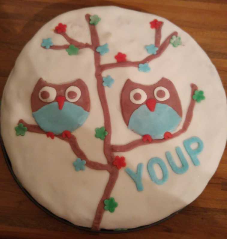 26 april: Vanavond hebben we even een proeftaart gebakken om te kijken hoe het zou uitpakken om er een mooie taart met marsepein van te maken. Het is prima gelukt allemaal, dus we hebben er vertrouwen in dat het met Youp zijn verjaardag helemaal goed gaat komen.
