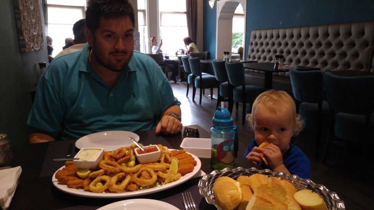 We stappen in de hop on bus terug naar ons hotel, waar we aan de overzijde van ons hotel in een lokaal restaurant belanden. Het eten was hier goedkoop en prima. Ook Youp kon prima smikkelen van zijn spaghetti bolognese. Tegen een uur of 10 gaan we weer terug naar ons hotel, waar deze avond bij de buren Anja en Emiel op de kamer wat gedronken wordt, zodat de babyfoon het nu wel haalt en we beiden dus wat kunnen drinken.