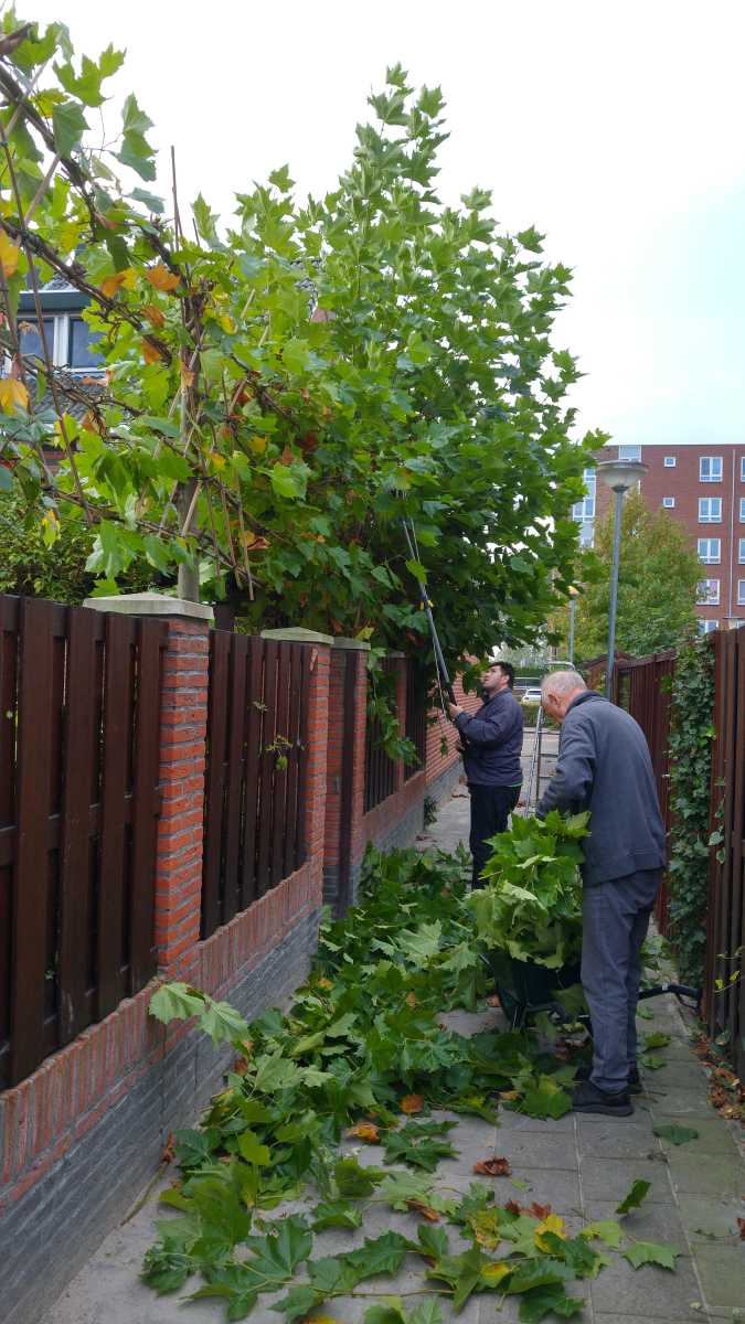 8 oktober: Vanochtend hebben we de leiplatanen aan de zijkant van de tuin en de leilindes voor het huis maar weer winterklaar gemaakt door ze volledig kaal te snoeien. Daar gaat altijd weer een hoop tijd in zitten want we zijn er zo'n vier uur mee bezig geweest. Maar het is weer klaar hoor....