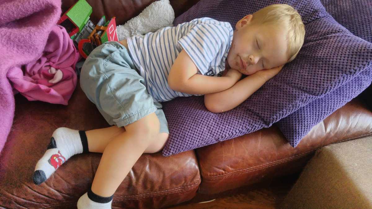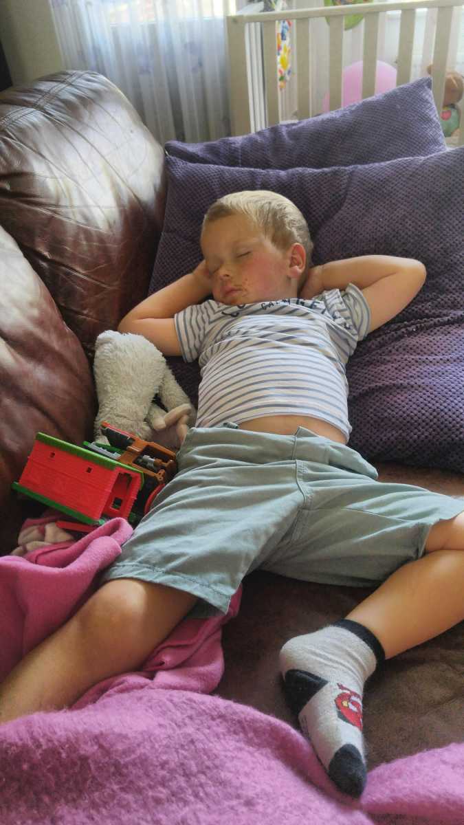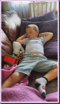 26 juni: Ik vind het soms toch nog een beetje te vermoeiend en dan ga ik lekker een tukkie doen op de bank. En mijn mond schoonmaken na wat te hebben gegeten let ik niet zo op, dat mogen papa en mama straks weer schoon boenen......
