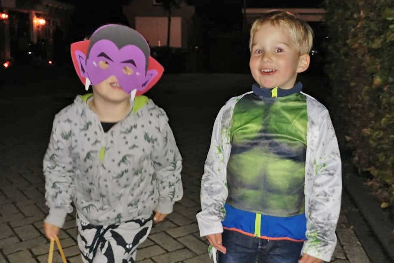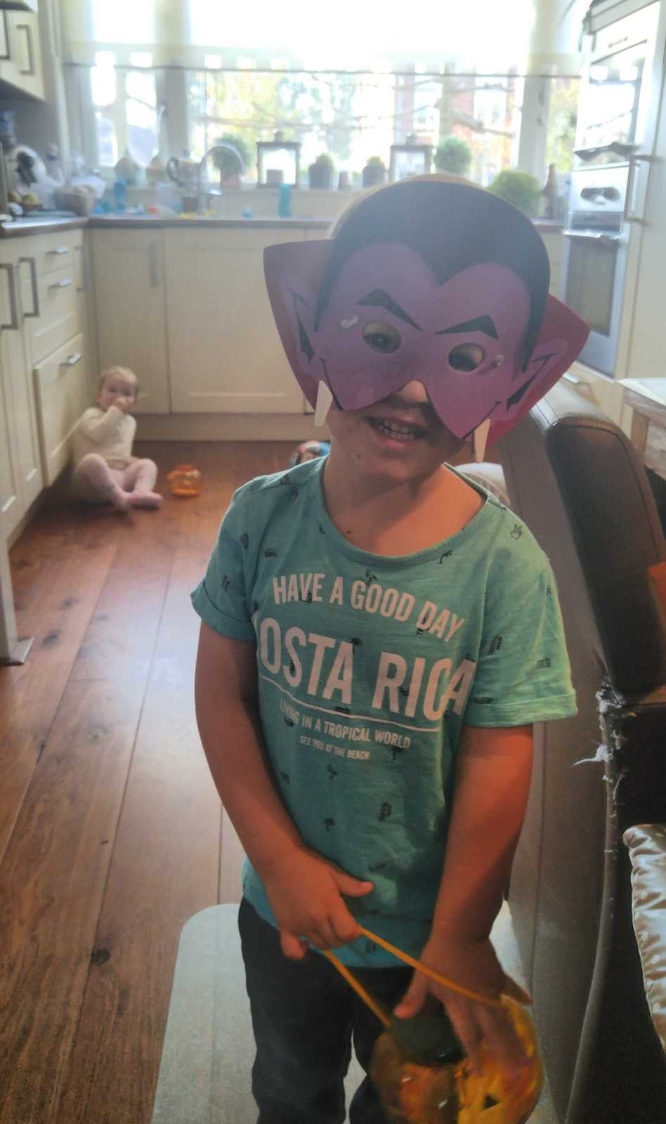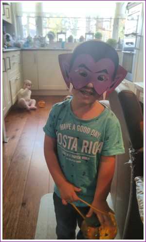 19 oktober: We hebben alvast wat spullen gehaald voor Haloween. Over een paar dagen mag ik meelopen in een optocht. Ik ben ook een heel goed monster hoor.......