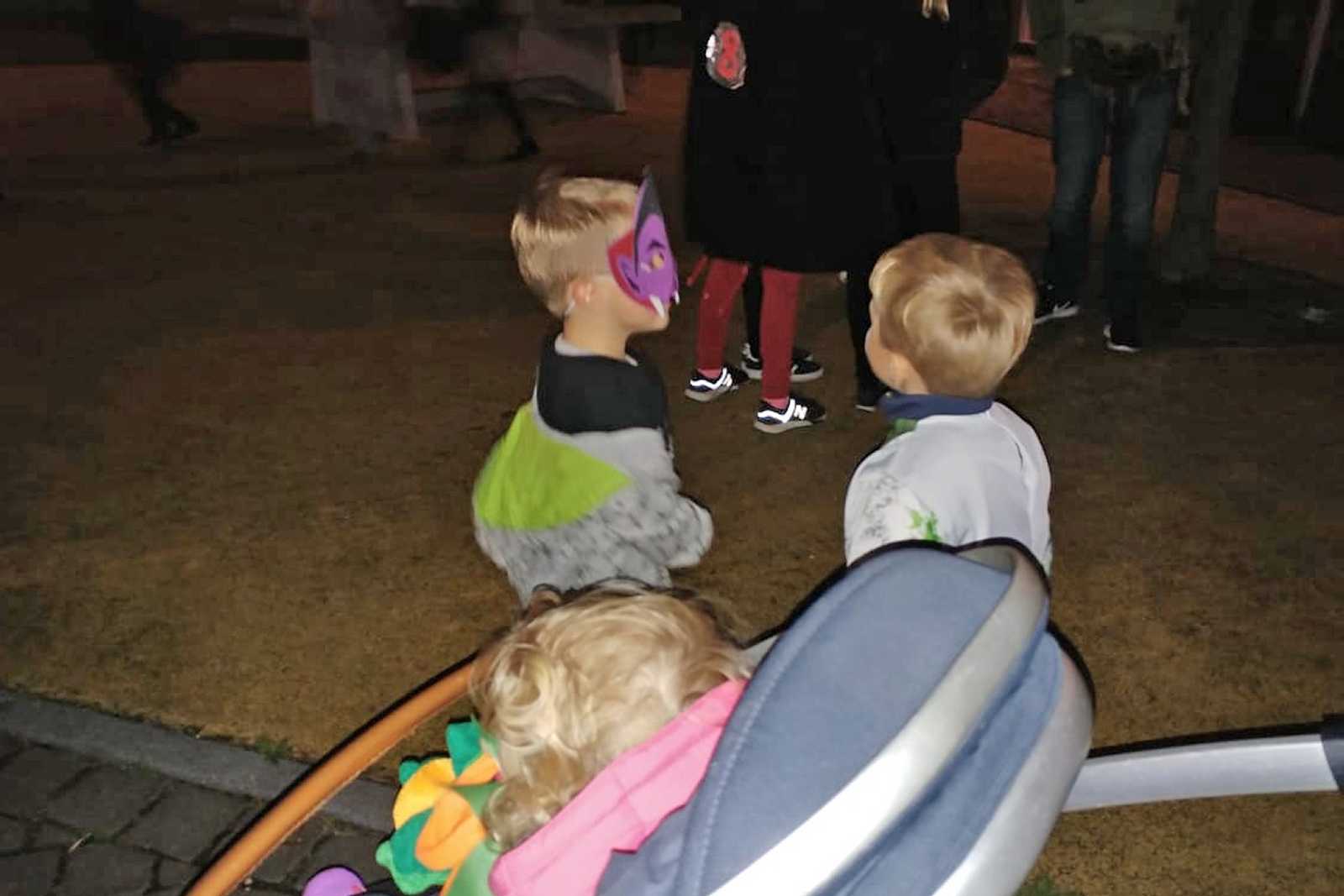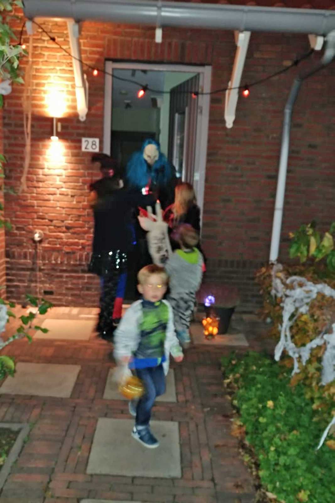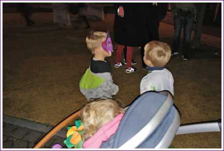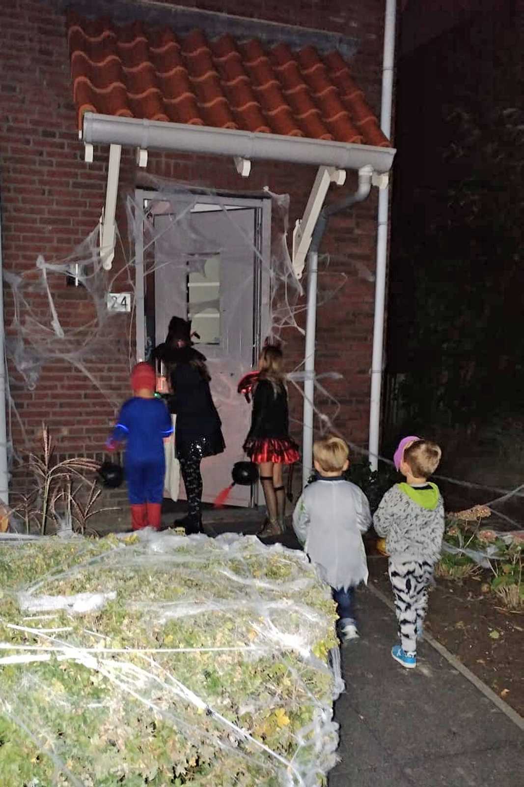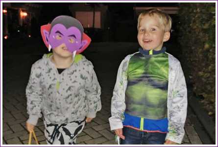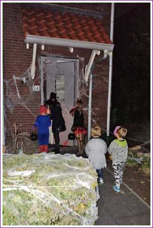 Maar de dag was nog niet om, want het was vandaag ook nog Halloween. En dus mocht ik 's-avonds samen met Lars en Bente meelopen in de Halloweenoptocht in Rhoon. Hier ben ik ook langs de deuren geweest om mensen te laten schrikken, en dan krijg je juist een snoepje. Ik werd door Lars steeds naar voren geschoven omdat hij het niet durfde te zeggen, maar ik zei gewoon 'een snoepje of je leven' en dan kreeg ik steeds snoep, wel twee potten vol. Leuk hoor.......