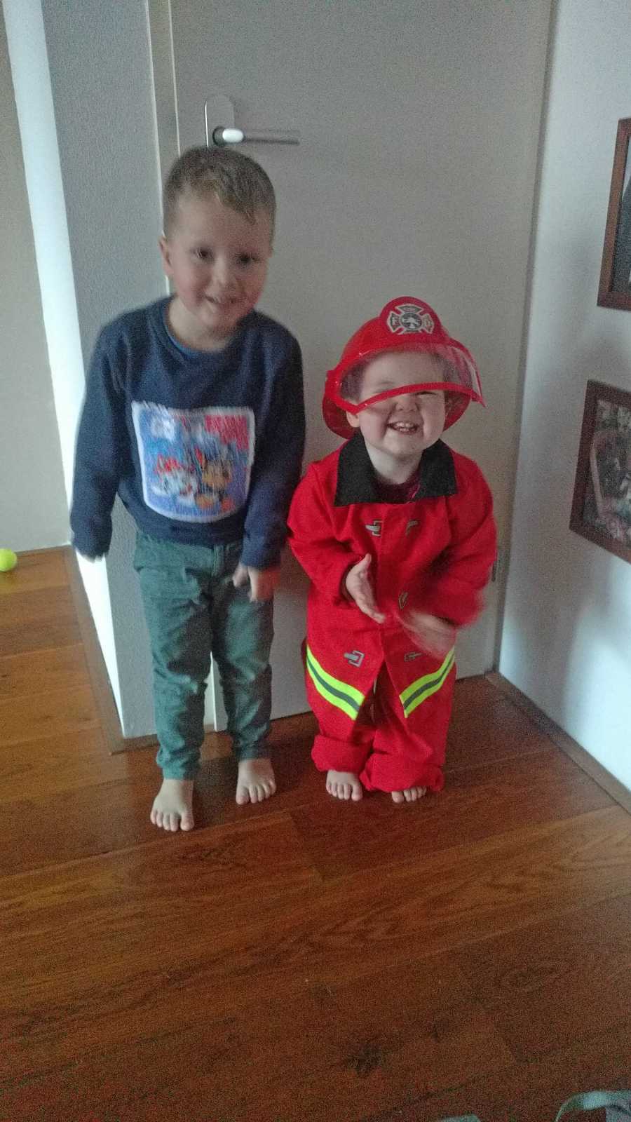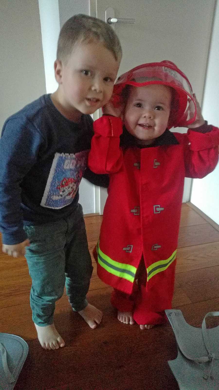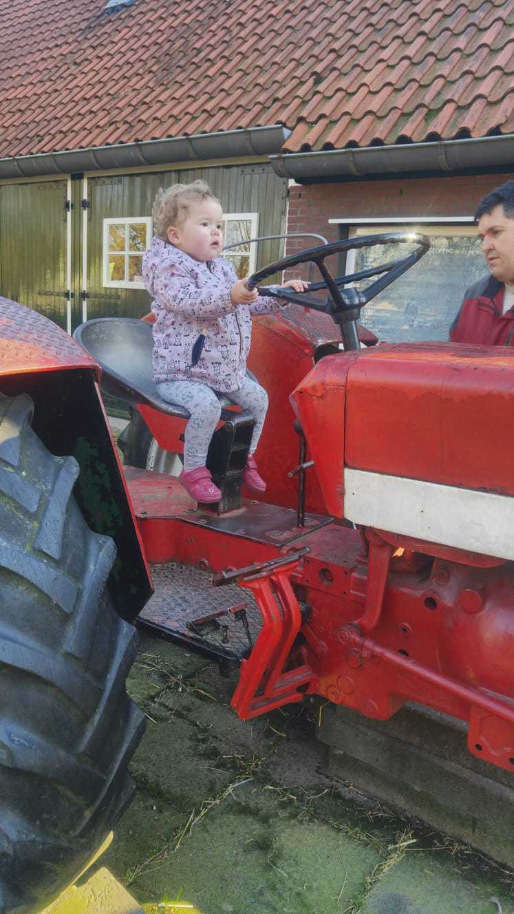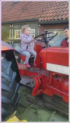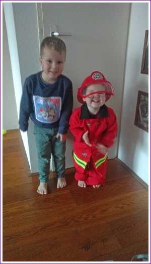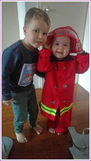 17 februari: Het brandweerpakje is nog erg groot voor Yfke, maar ze wilde het persé aan en er mee op de foto.........