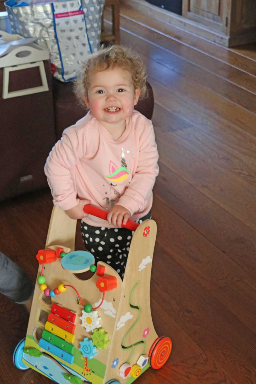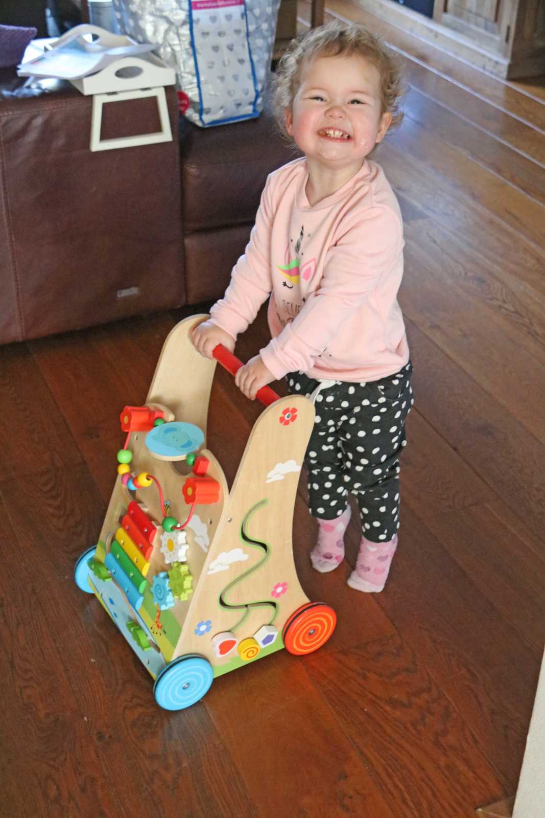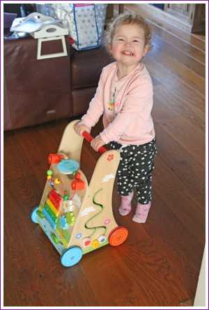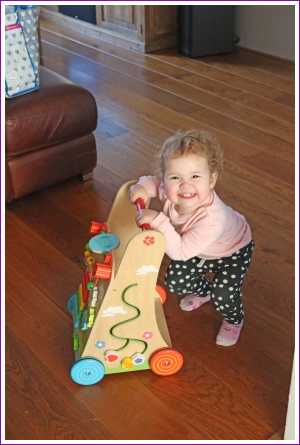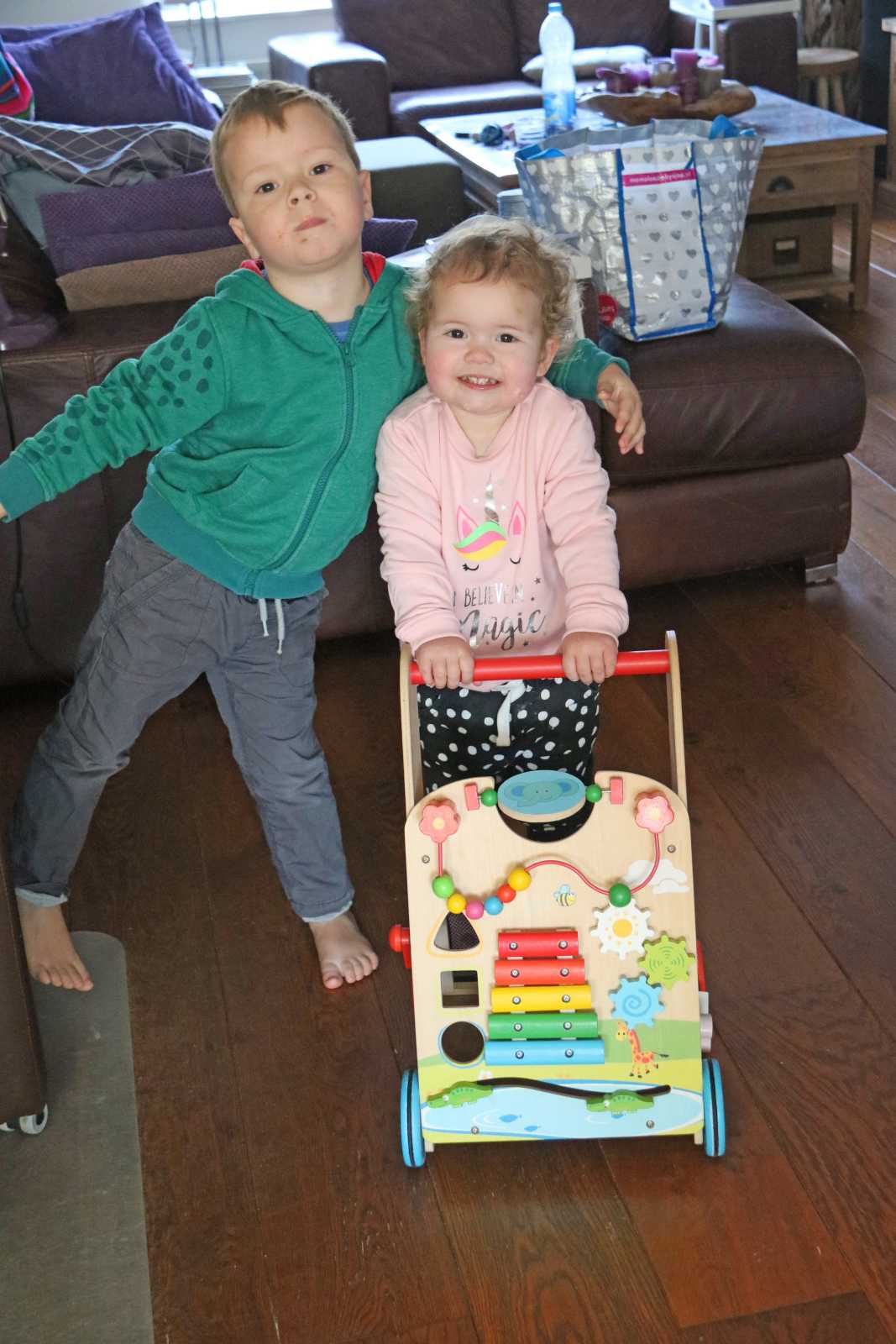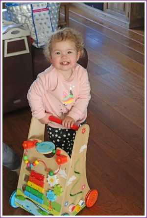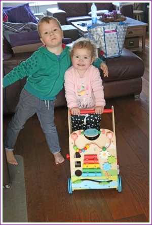 19 februari: We moesten thuis nog even poseren met de loopwagen van Yfke die weg zou gaan.........