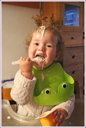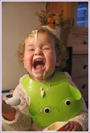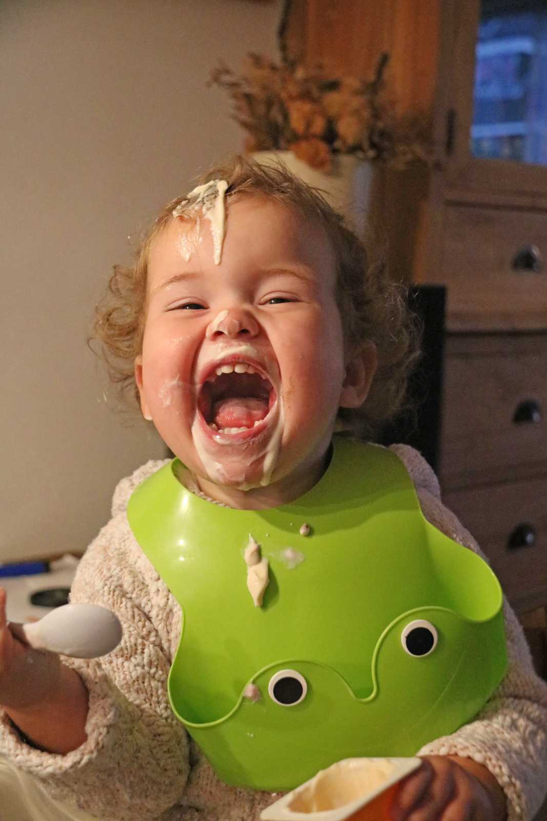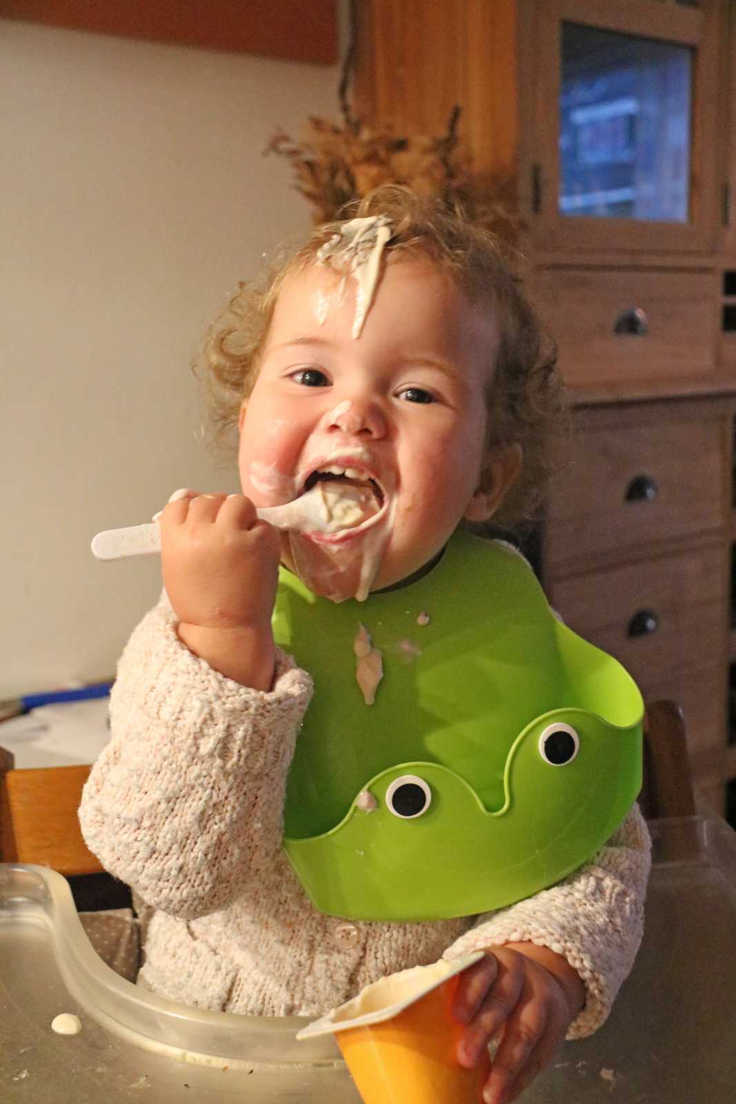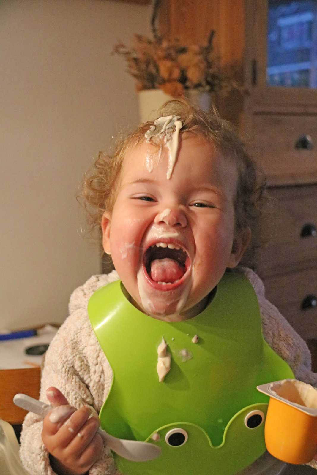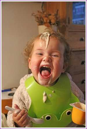 12 maart: Wij kunnen er thuis bij het eten best een zootje van maken, zeker Yfke wil alles zelf doen maar gaat soms met haar eten spelen, vooral met het toetje........