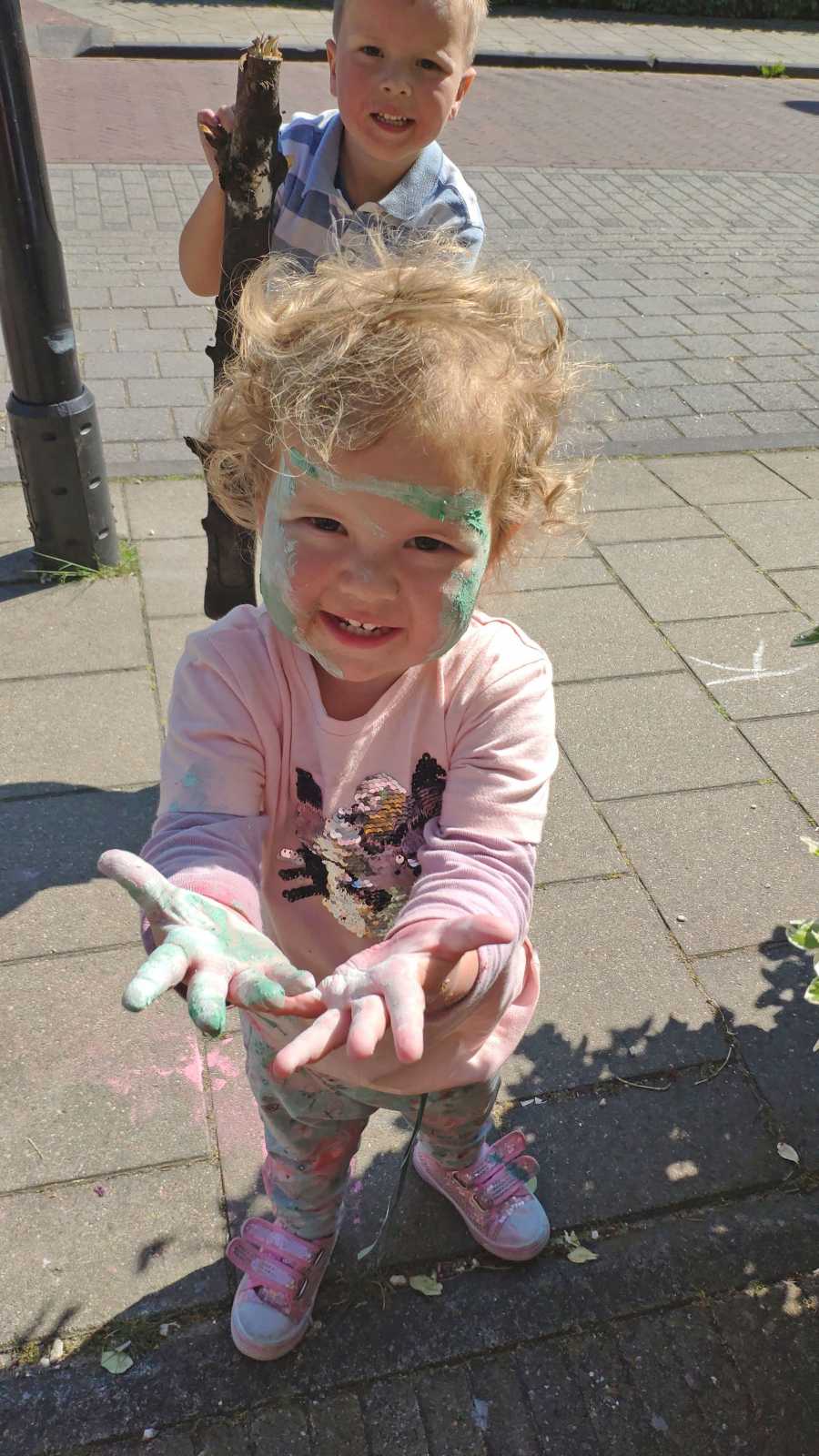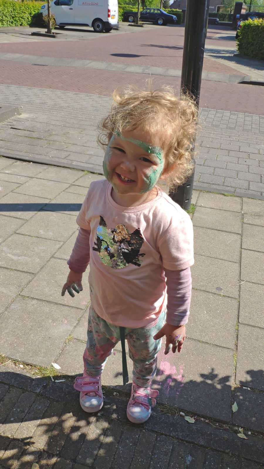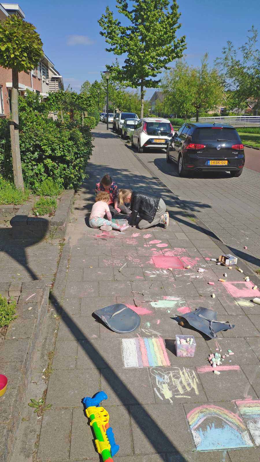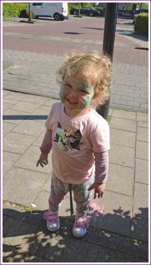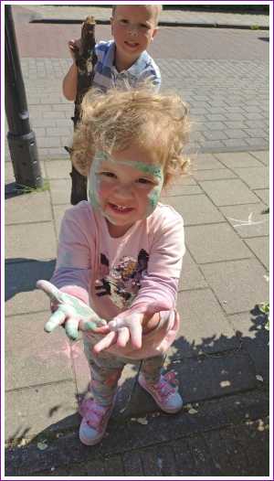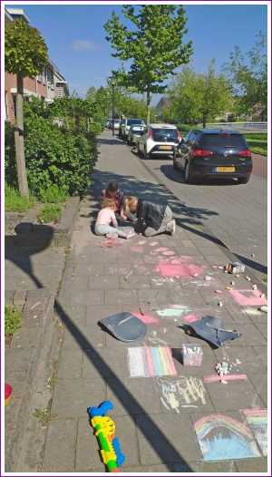 Eenmaal weer thuis hebben we voor de deur met stoepkrijt gespeeld. Yfke konden we mooi gebruiken als kleurplaat......