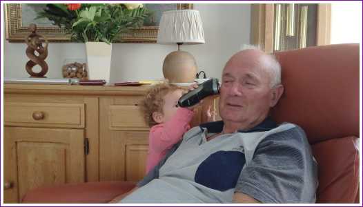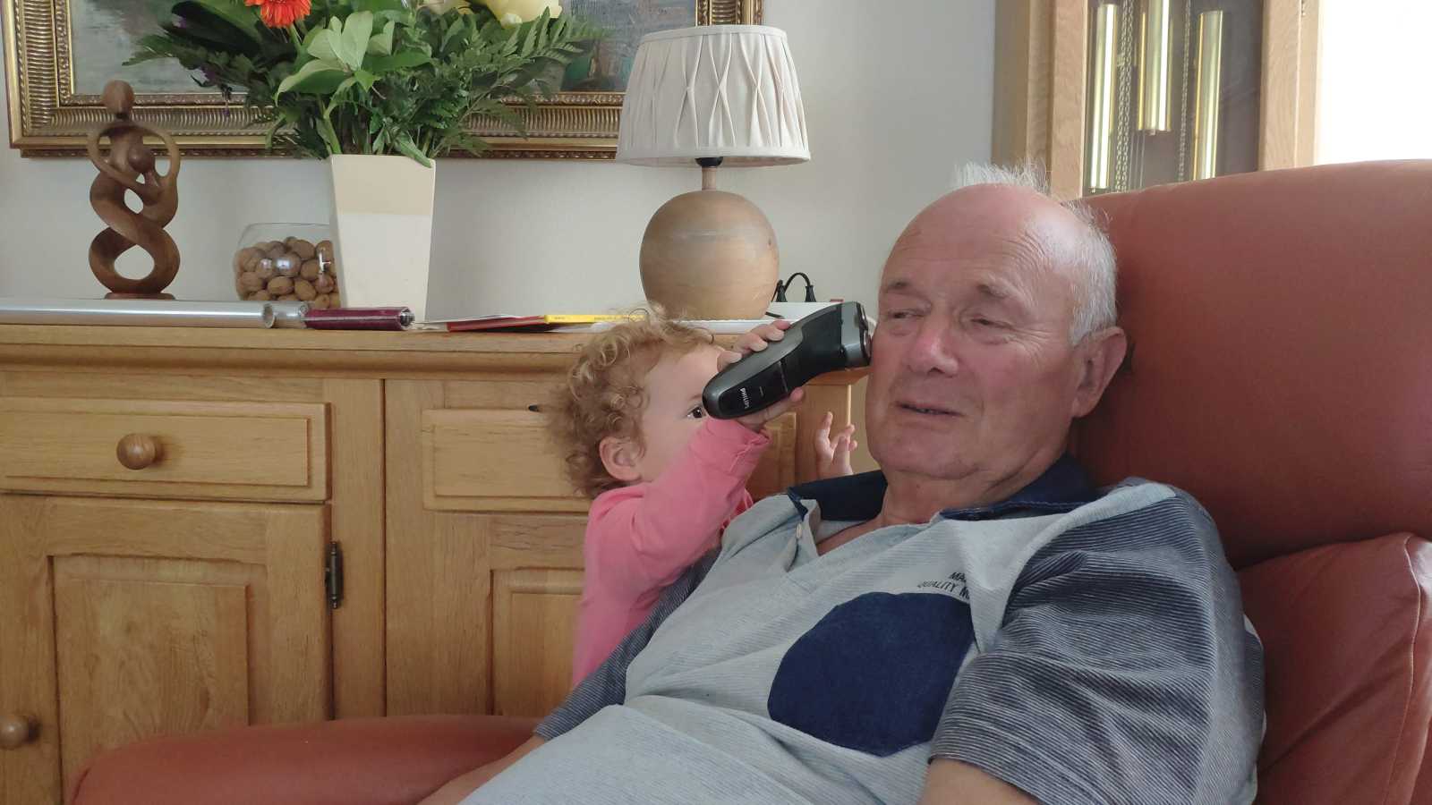 24 mei: We zijn bij opa en oma geweest en Yfke mocht opa even scheren. Dat kan ze al best goed.........