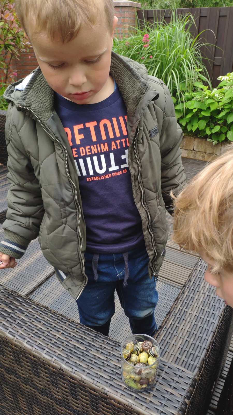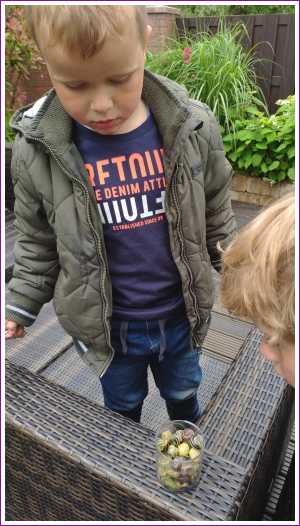 28 mei: Yfke mocht vandaag lekker even rijden in de auto bij de ANWB winkel. Youp heeft samen met Evan even een potje vol slakken verzameld.........