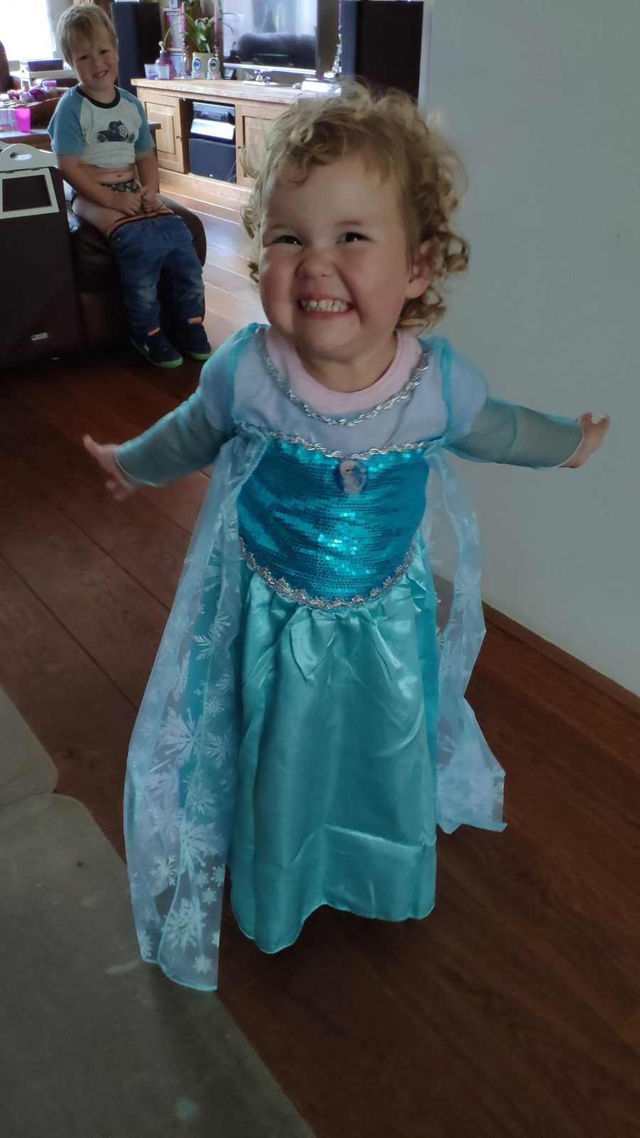 4 september: Vandaag kwam er met de post een prinsessenjurk voor Yfke, die wilde ze wel aan........