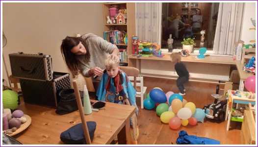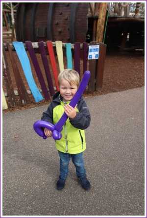 14 oktober: Mama was gisteren jarig en had vandaag op haar werk veel balonnen gekregen aan een touwtje. Daar weten wij thuis wel raad mee.........