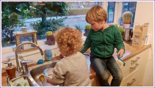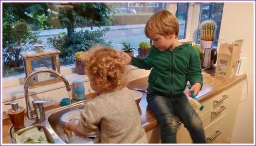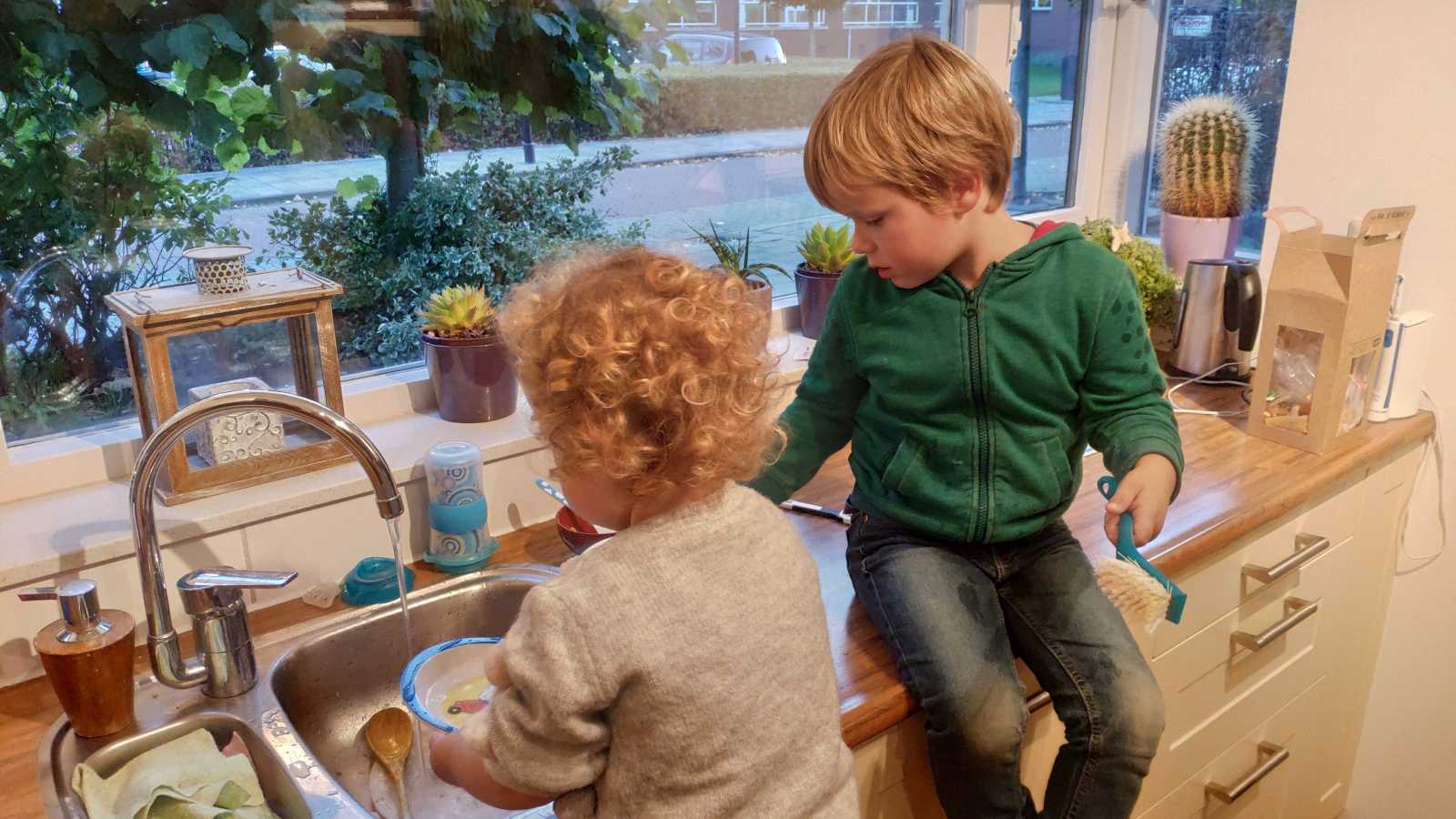 17 oktober: Als mama weg is en papa moet alleen afwassen dan zijn wij niet te beroerd om even te helpen.........