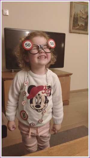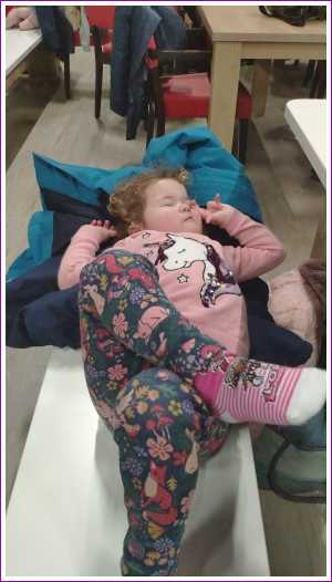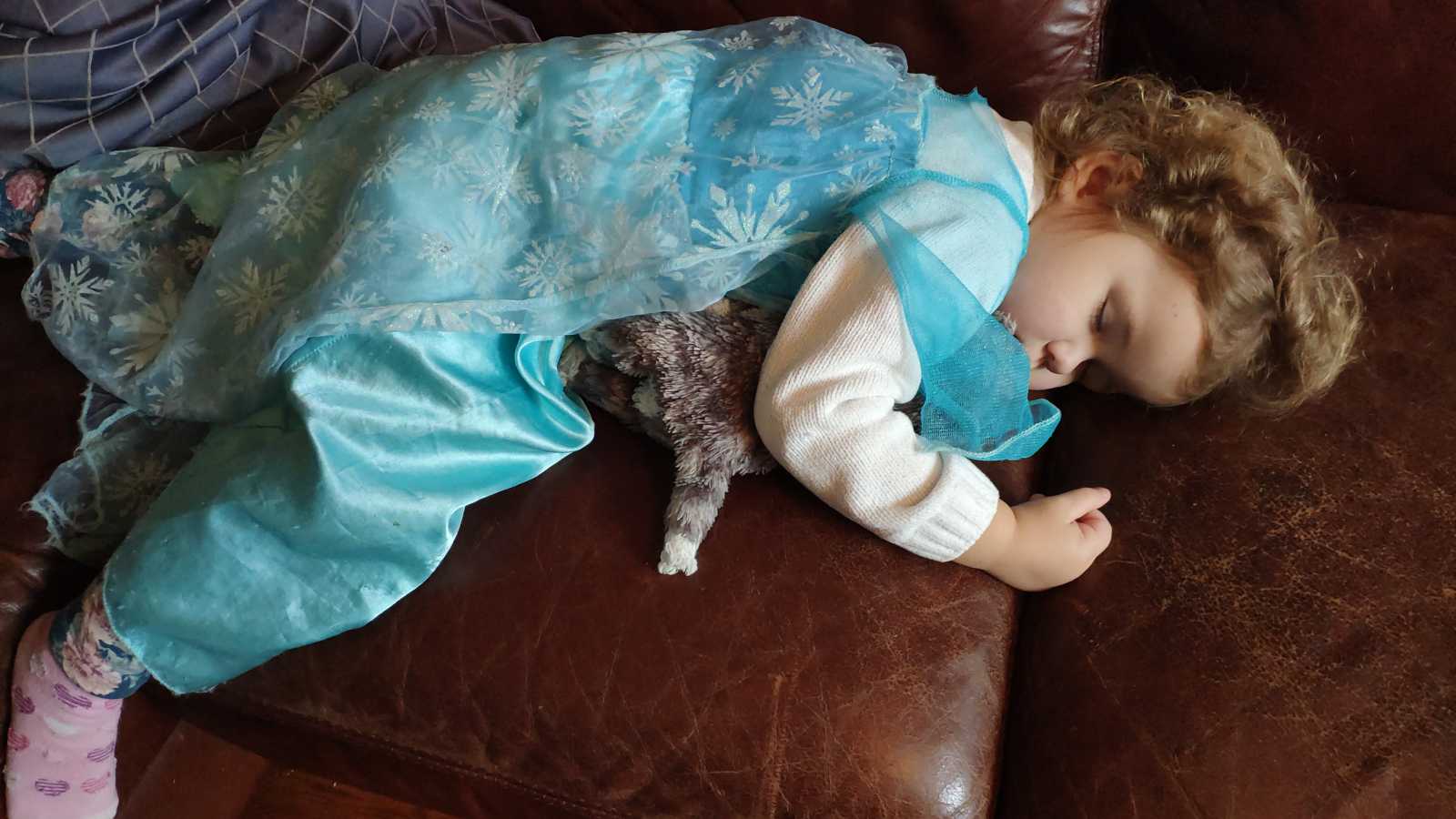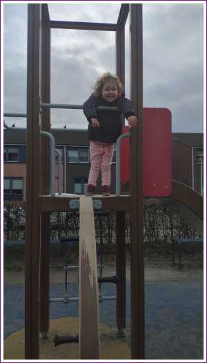 13 februari: Toen ik nog op school was en Yfke thuis aan het spelen was is ze op de bank in slaap gevallen met haar Elsa jurk aan. Maar toen ze weer wakker was is ze mij 's-middags op school op komen halen, ze heeft toen nog even op het schoolplein gespeeld. Vervolgens zijn we naar mijn zwemles gegaan, en aansluitend naar opa en oma. Die waren vandaag precies 50 jaar getrouwd. Al met al een vermoeiende dag, dus in de auto terug naar huis alvast tijd voor een tukje........