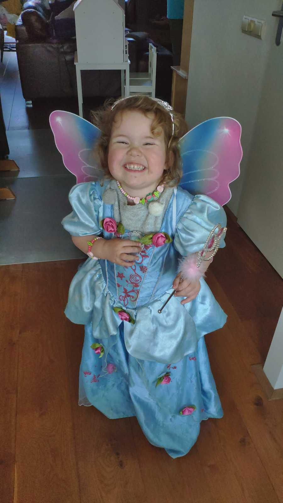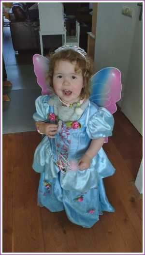 7 april: Yfke is een prinses en een elfje in een, een mooie jurk maar ook vleugels.......