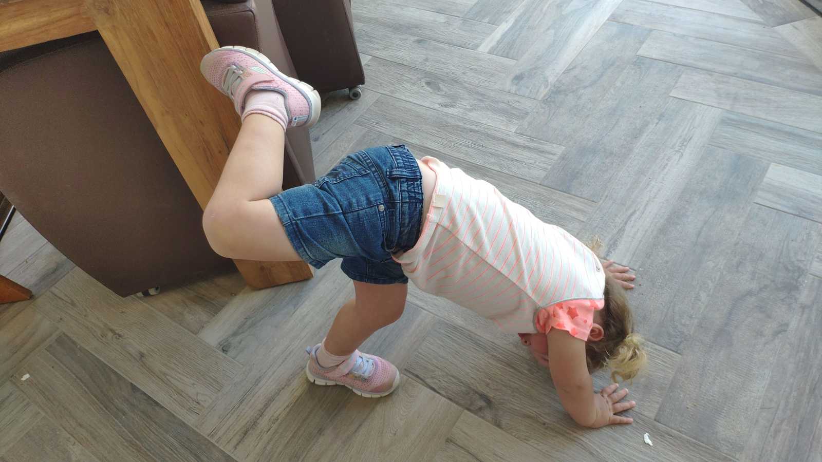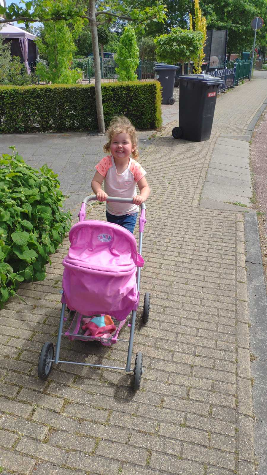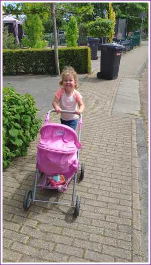 19 mei: Wij gaan gekke bekken trekken en koprollen. Yfke moest zo nodig de kinderwagen mee om mij bij school op te halen.......