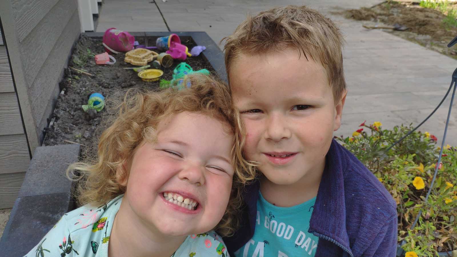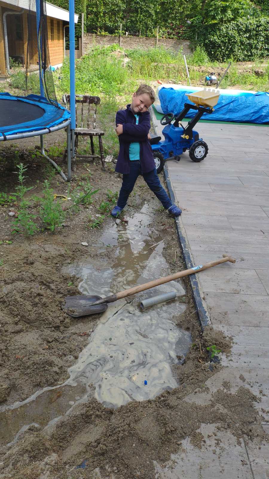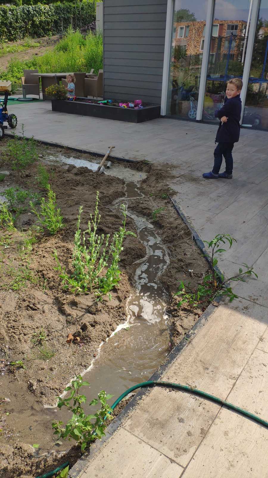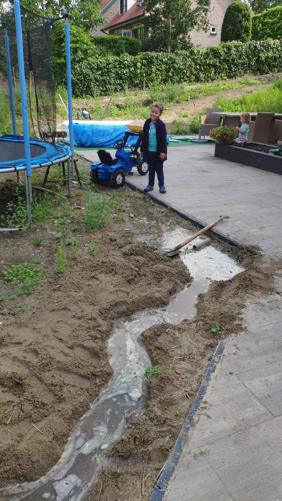 17 juli: De laatste schooldag, het zit er weer op voor dit jaar. Eenmaal thuis heb ik lekker even een greppel gegraven in de tuin om water in te doen. En natuurlijk is het ook altijd leuk om even samen met Yfke te poseren voor een foto.........