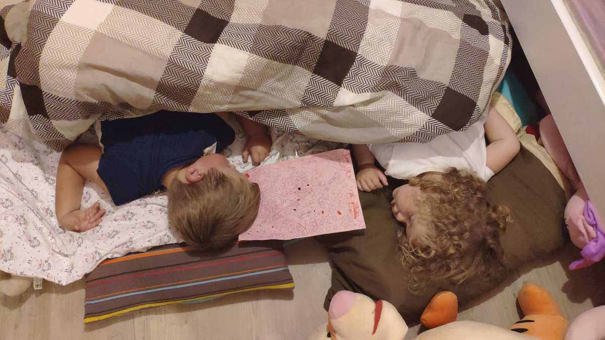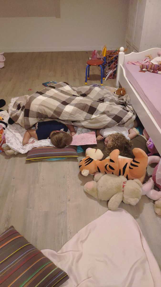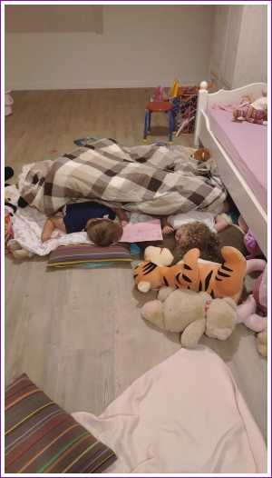 24 juli: Wij vinden dat opa een verhaaltje moet komen vertellen. Maar dat gebeurde niet, en toen zijn we bij Yfke in haar kamer op de grond in slaap gevallen........