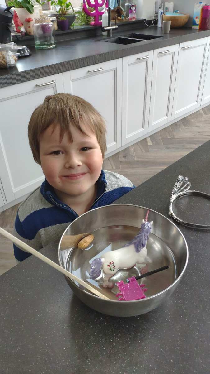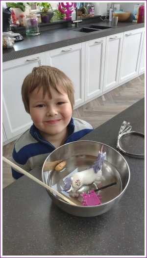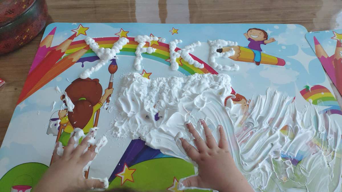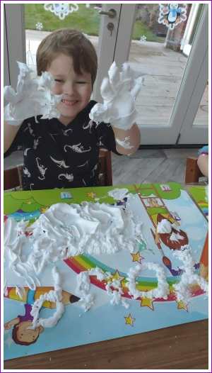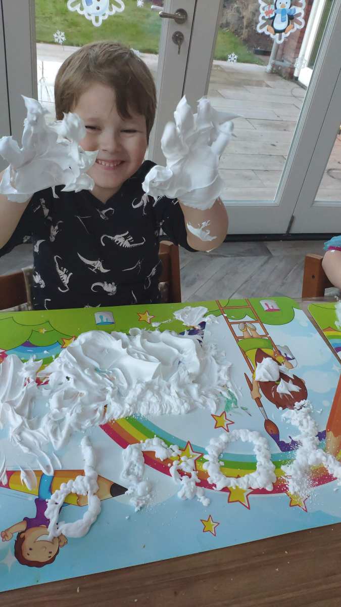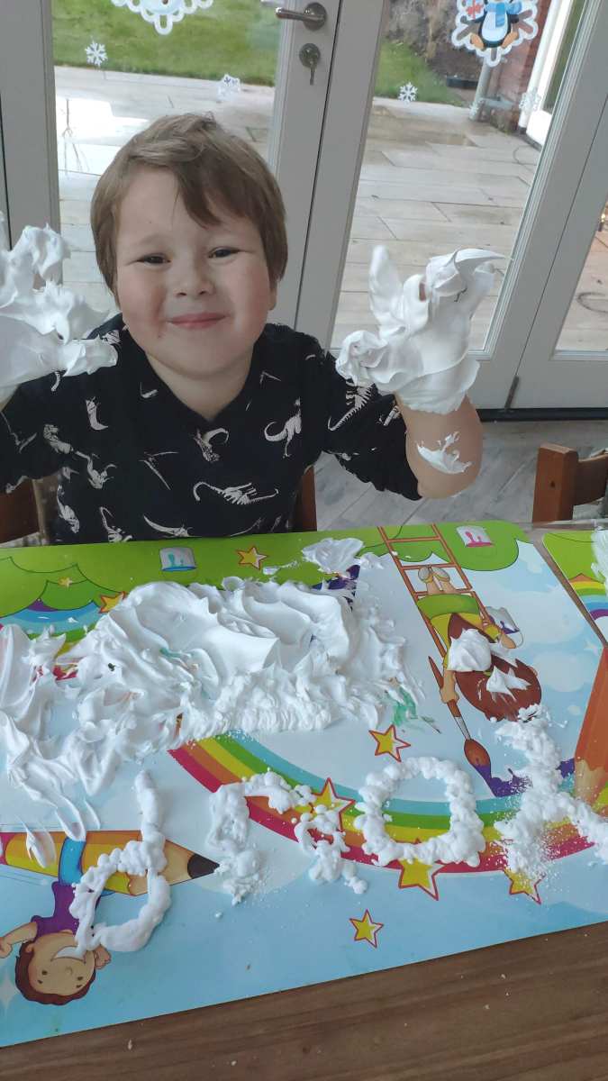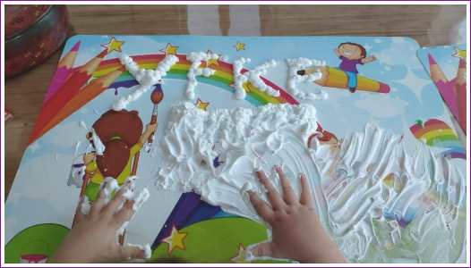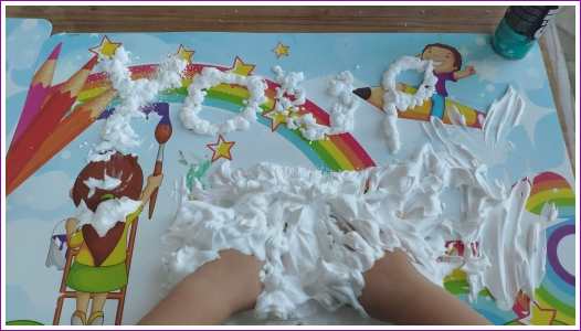 8 januari: Ik heb weer een nieuwe opdracht, met scheerschuim spelen.........