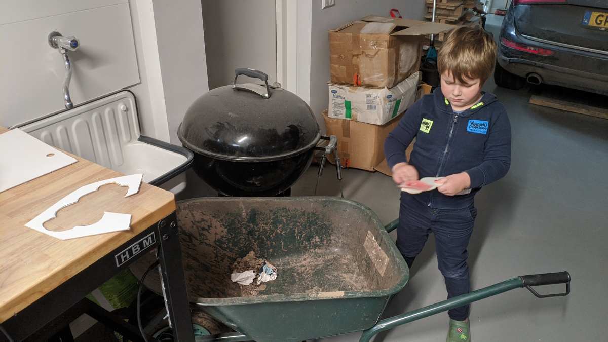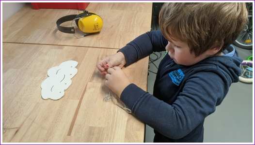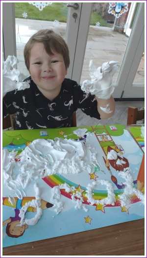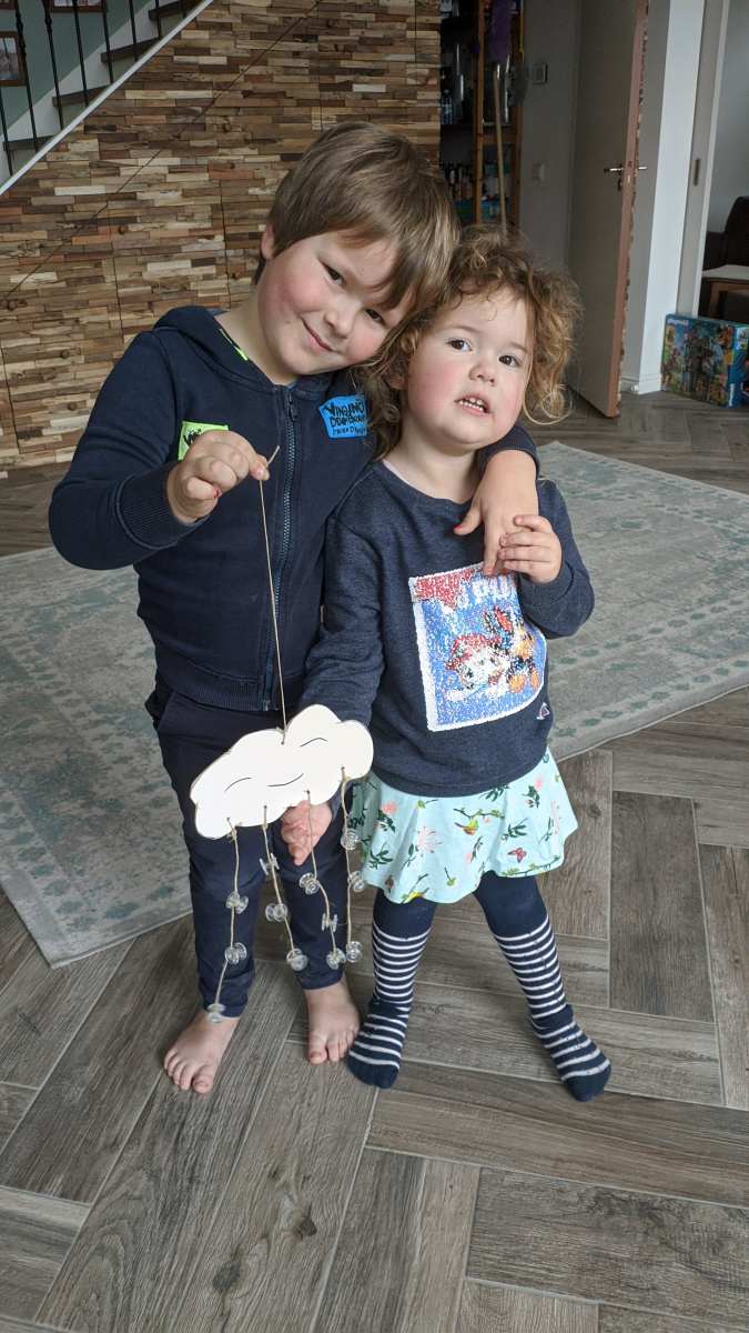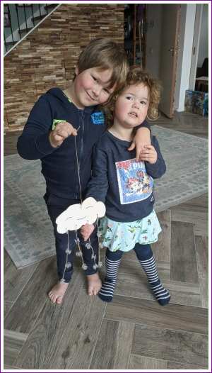 28 januari: Ik moest vandaag als huiswerk een wolk in elkaar knutselen. Dus ik heb met papa in de garage een wolk gezaagd en hier gaatjes in geboord. Daarna hebben we er met een soort kralen regendruppels aan gemaakt.