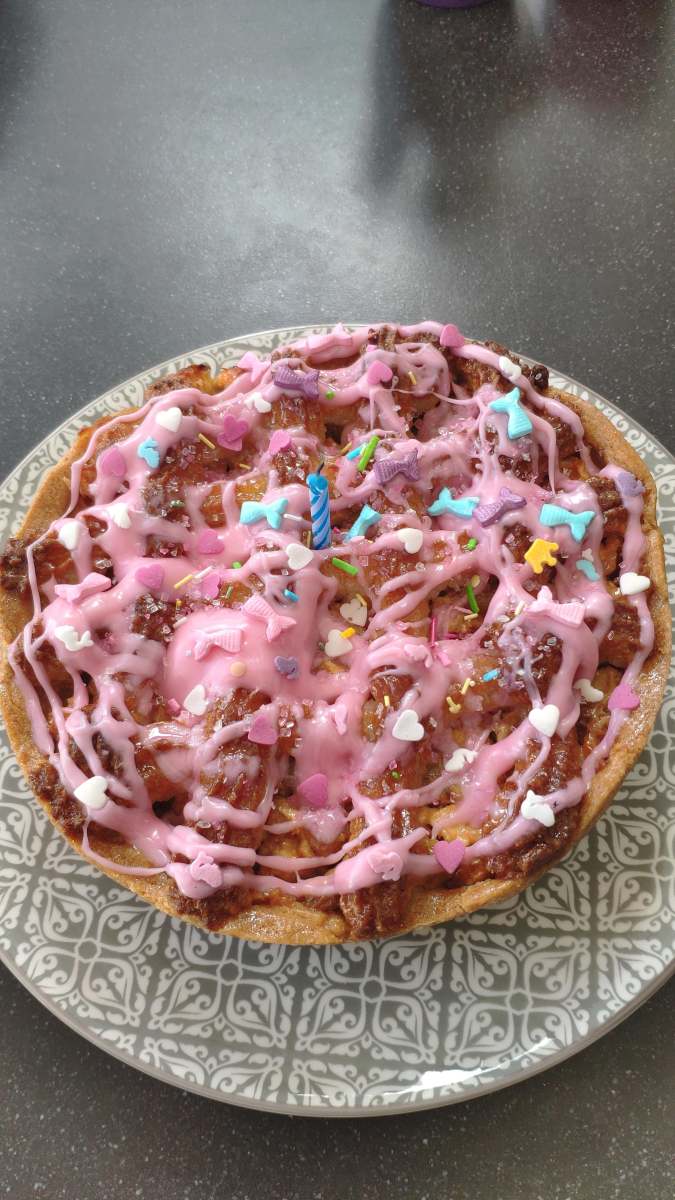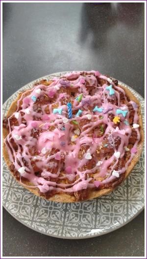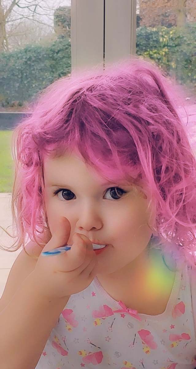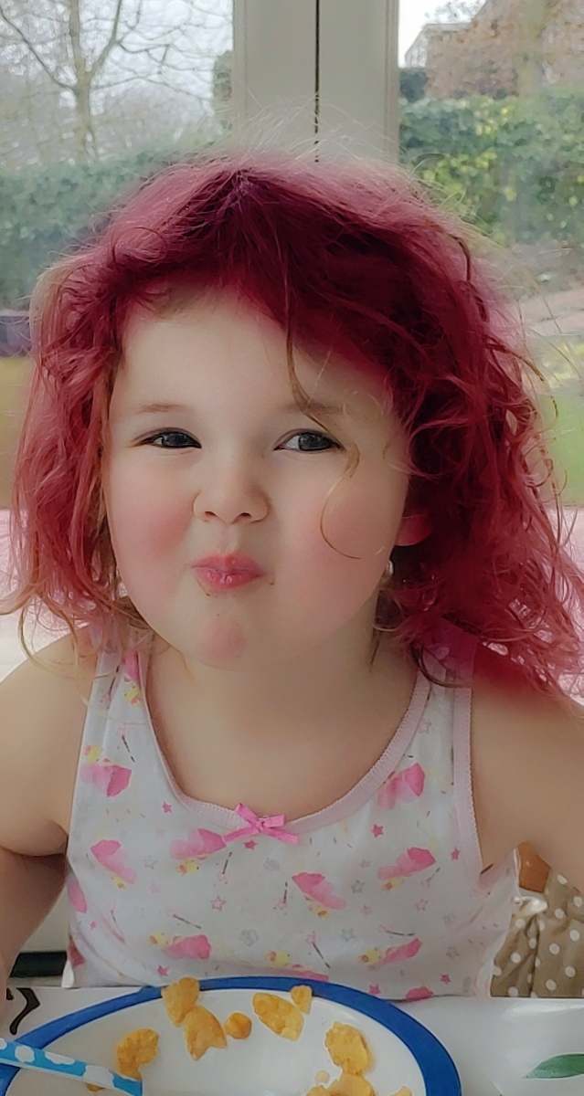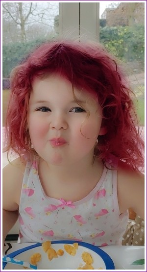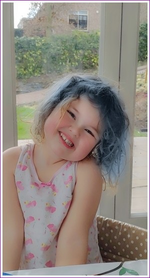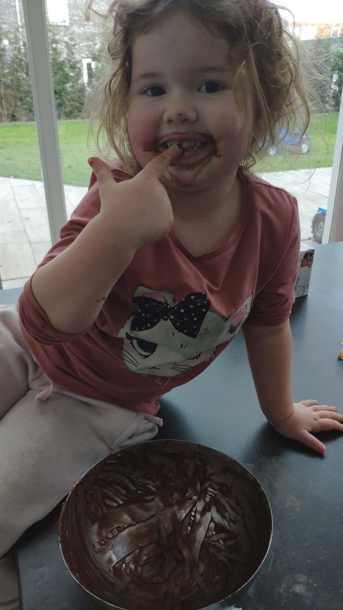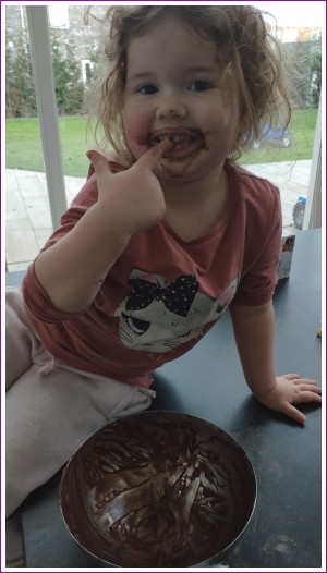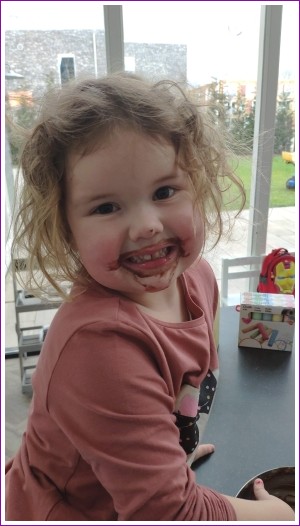 13 maart: Terwijl ik op school bezig was om tuinkers te laten groeien, heeft Yfke thuis met mama wat gebakken en mocht ze de kom uitlikken. Maar Yfke: stop het nu eens in je mond in plaats van er omheen..........
