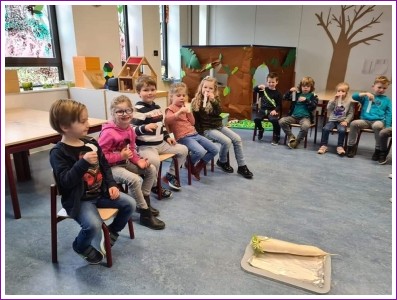 18 maart: Op school kregen we uitleg over de groente Rettich. Er waren er twee en die werden verloot. Ik heb er eentje gewonnen dus die mocht mee naar huis....