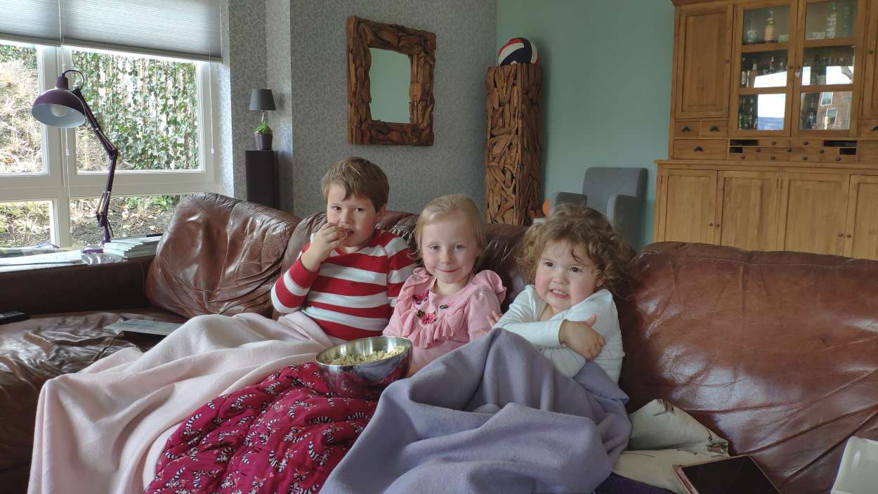 27 maart: Buurmeisje Hannah kwam even spelen en toen hebben we op de bank popcorn mogen eten........
