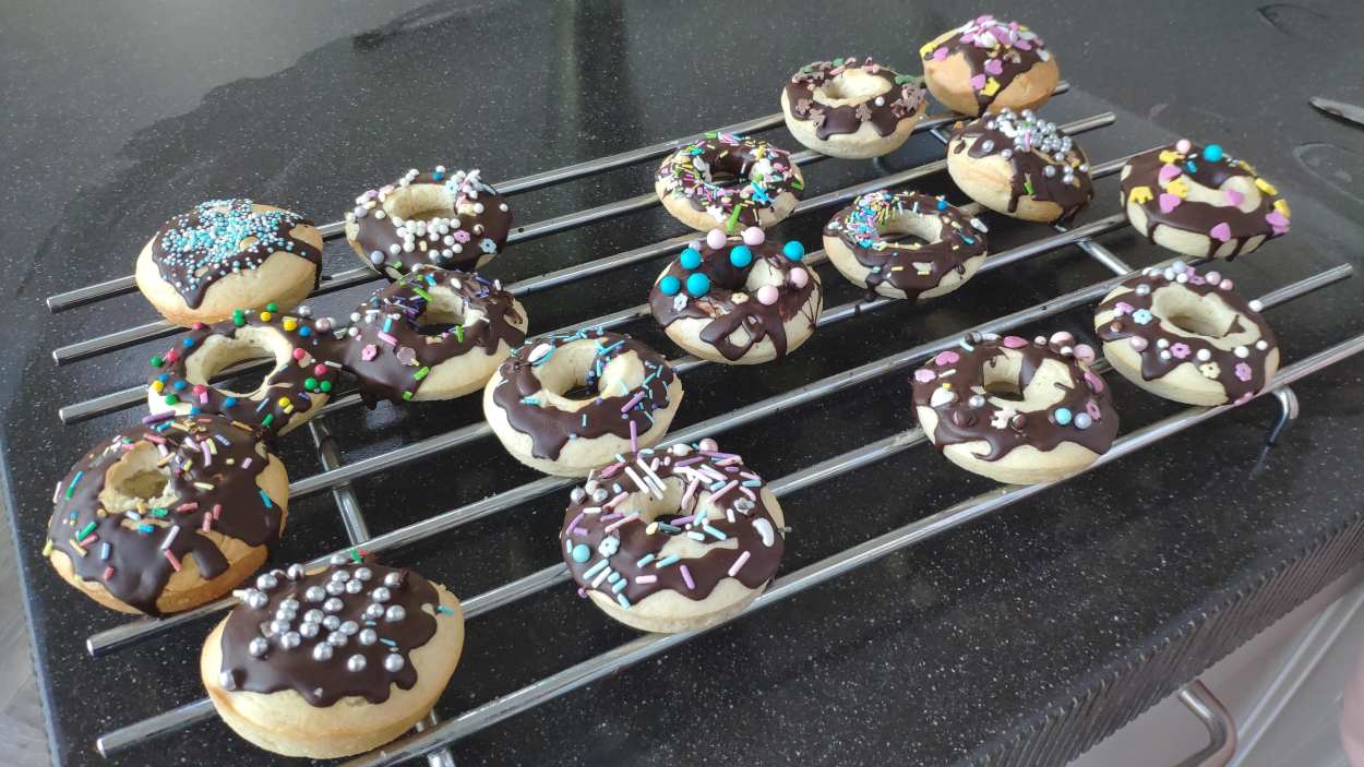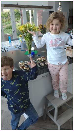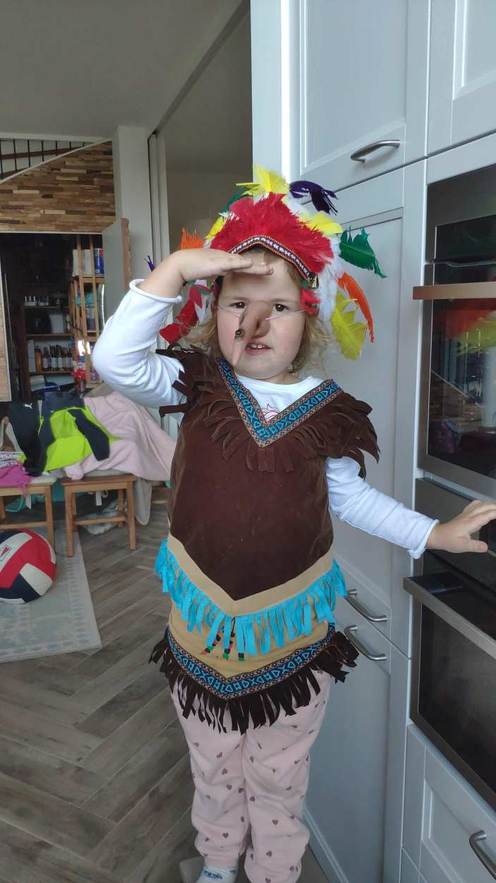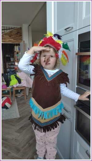 21 oktober: We hebben samen met mama donuts gebakken. Yfke heeft ook nog even indiaan gespeeld maar dan met heksenneus.......