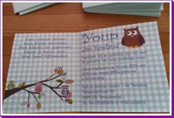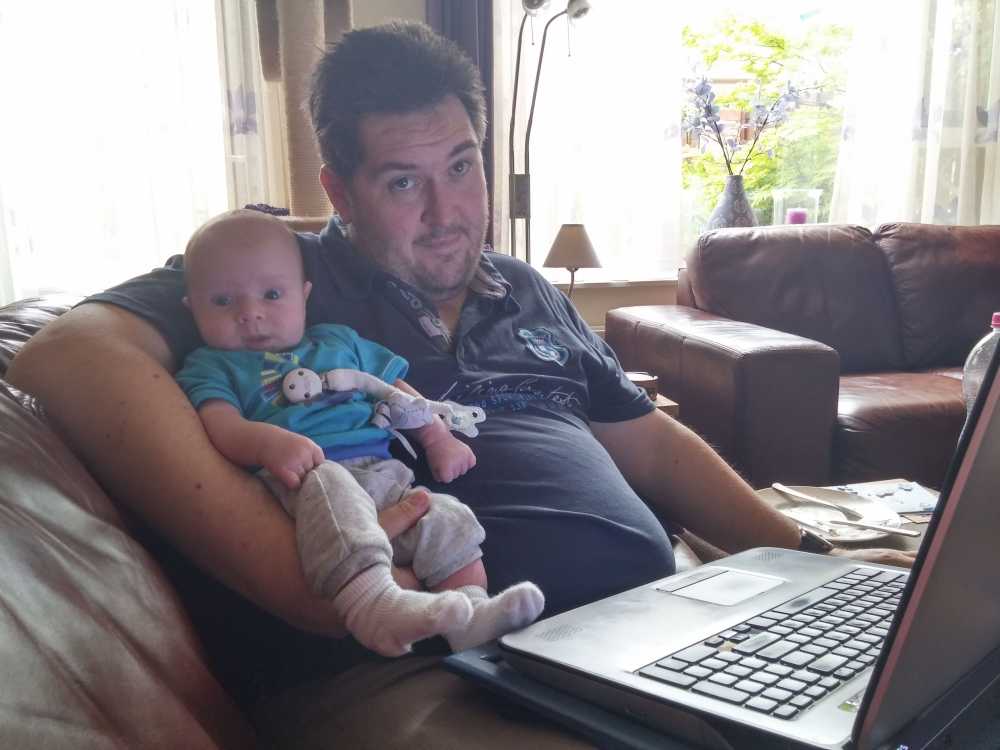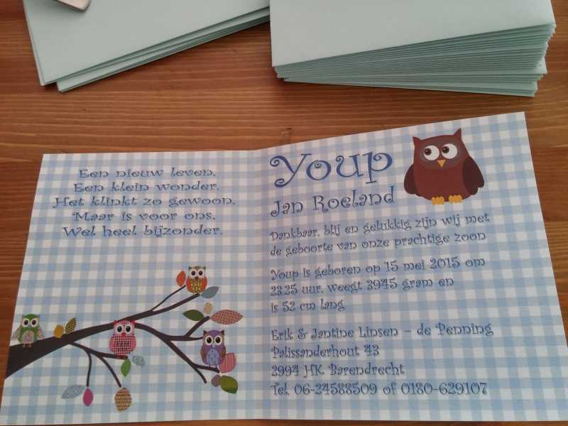 17 mei: Vanochtend en vanmiddag heeft Erik de geboortekaartjes zitten maken. Jantine heeft ook nog even gepoogd te helpen maar Youp eiste toch de meeste tijd op. Gelukkig kon ook kraamhulp Mirjam nog de helpende hand bieden zodat de kaarten halverwege de middag in de envelop zaten en dus klaar waren voor verzending.