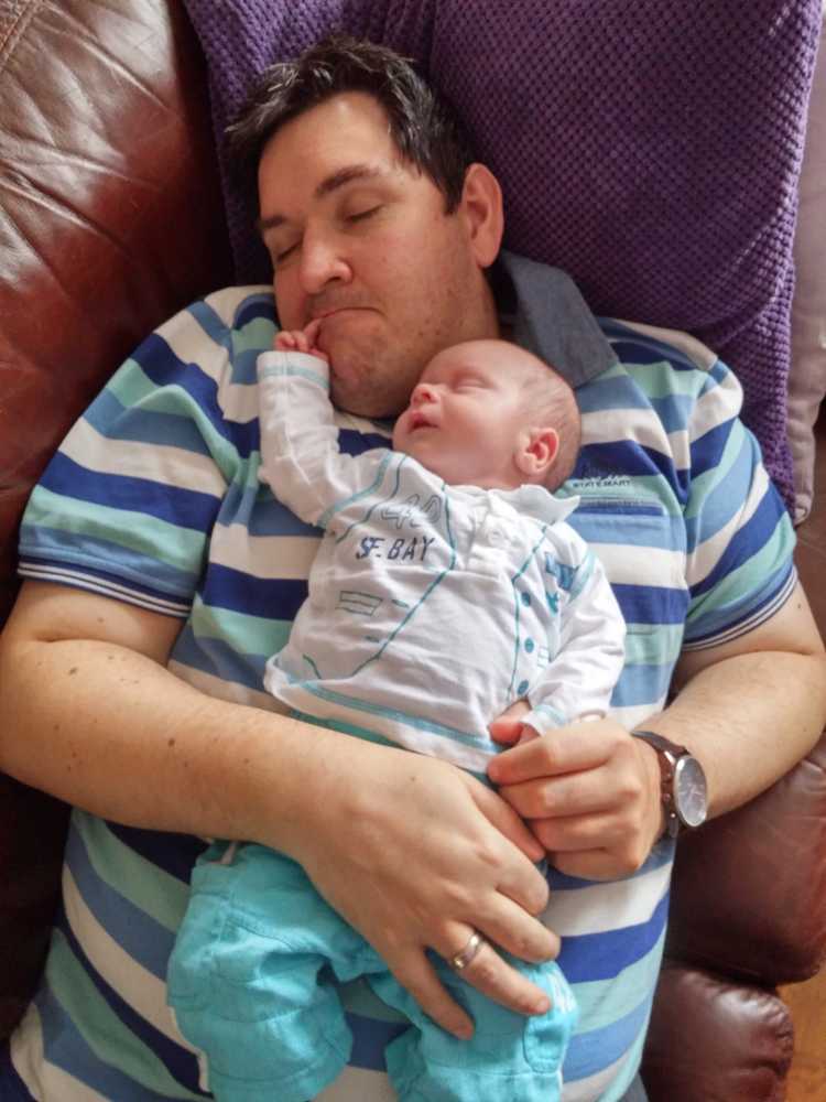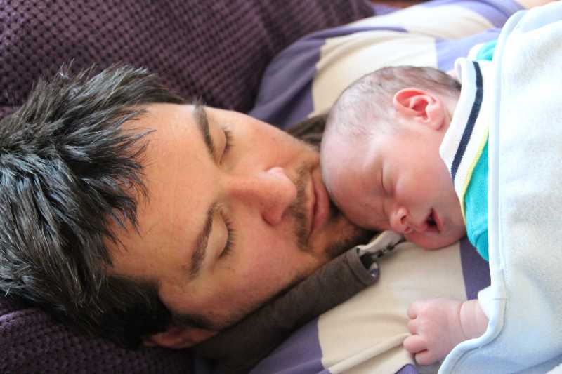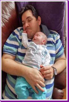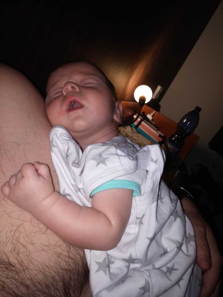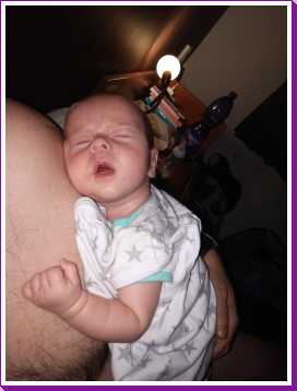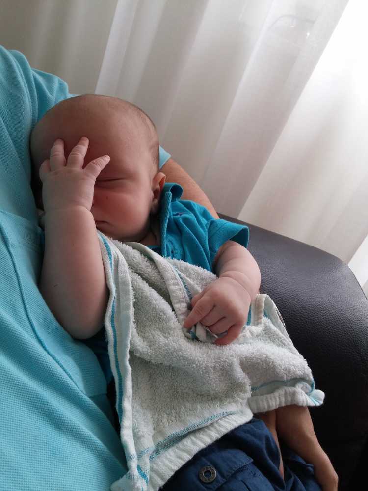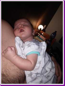 Na zo'n vermoeiende dag kan ik het niet meer opbrengen om na mijn laatste fles te boeren, dus ik val gewoon bij papa op de schouder in slaap.